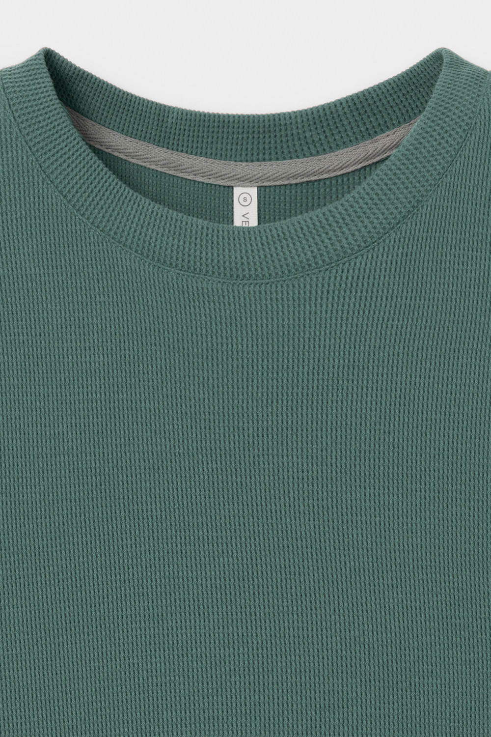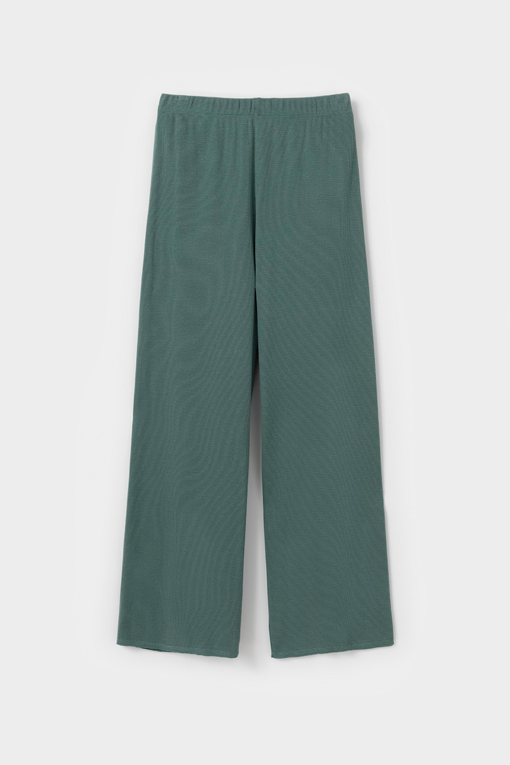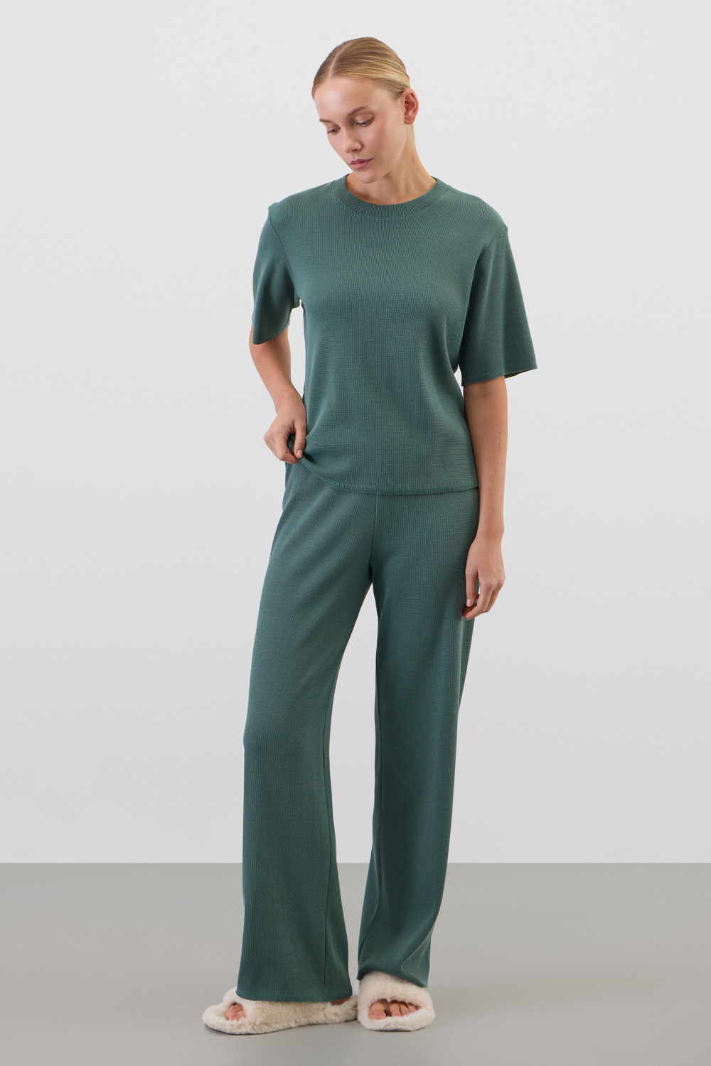 Комплект из объемного трикотажа с добавлением эластичных волокон. Свободный силуэт и мягкий пояс брюк обеспечат комфорт во время сна и отдыха.