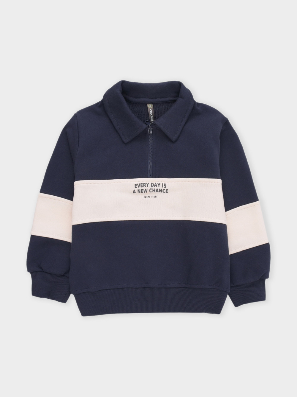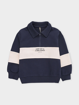 Свитшот с воротником для мальчика. Изготовлен из высококачественного петельчатого футера трёхнитки. Манжеты и пояс выполнены из эластичного полотна. На груди короткая застёжка на молнию. Оригинальный принт выполнен из стойких текстильных гипоаллергенных красителей. Изделие сохраняет цвет и форму после многократных стирок.