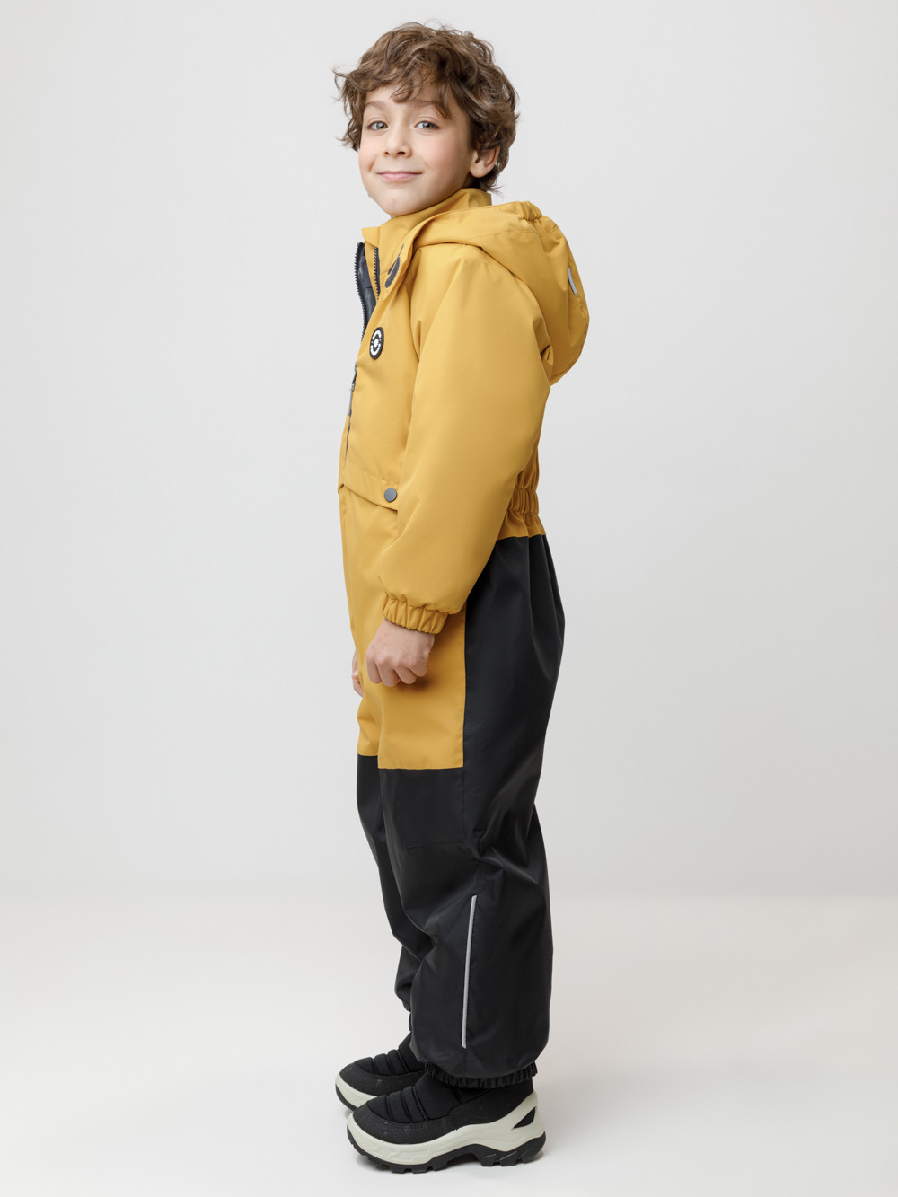 Демисезонный комбинезон для мальчика с утеплителем SEE®, 120 г/м2. Выполнен из мембранной ткани с дополнительной тефлоновой обработкой. Данный вид обработки предохраняет изделие от загрязнения и лучше отводит влагу. Подклад из 100% полиэстера. Для удобного одевания комбинезон застёгивается на удлинённую молнию с защитой подбородка. Капюшон не снимается, по верхнему краю есть эластичная вставка. По низу рукавов и брючин, а также на спинке изделия предусмотрены эластичные резинки для лучшего прилегания. Для фиксации комбинезона используются съёмные силиконовые штрипки. Во всех изделиях верхнего ассортимента для безопасности ребёнка предусмотрены светоотражающие элементы.