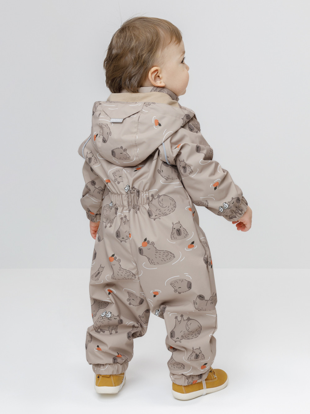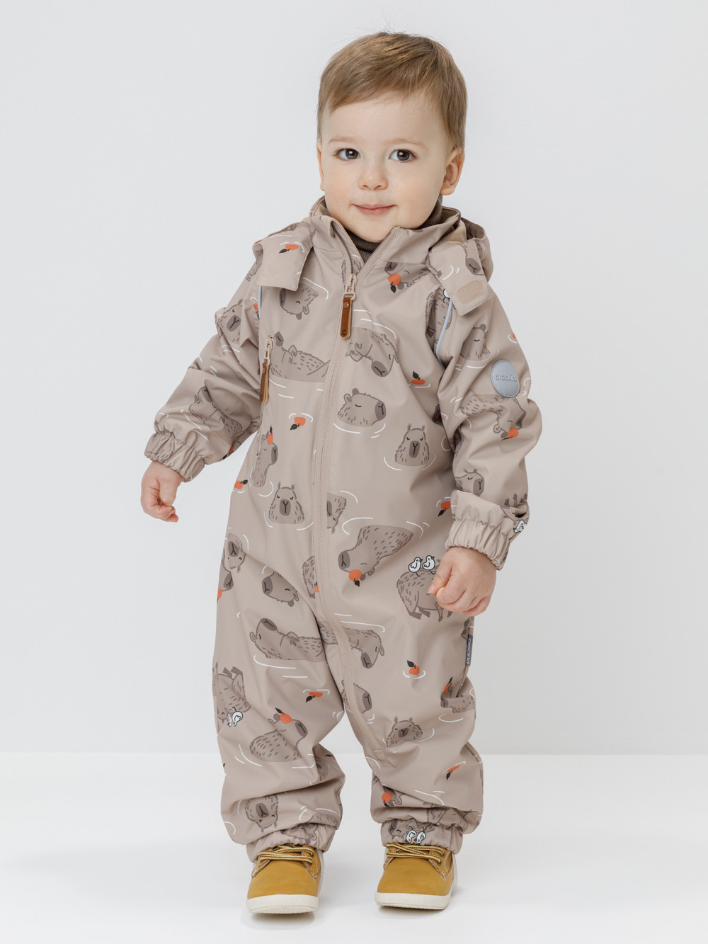 Ветровочный комбинезон ясельный без утеплителя. Выполнен из мембранной ткани с дополнительной тефлоновой обработкой. Данный вид обработки предохраняет изделие от загрязнения и лучше отводит влагу. Подклад из 100% хлопка. Для удобного одевания комбинезон застёгивается на удлинённую молнию с защитой подбородка. Утяжка на капюшоне с потайным стоппером. По низу рукавов и брючин, а также на спинке изделия предусмотрены эластичные резинки для лучшего прилегания. Для фиксации комбинезона используются съёмные силиконовые штрипки. В размерах 68-74 и 74-80 есть функциональные отвороты на рукавах и брючинах. Во всех изделиях верхнего ассортимента для безопасности ребёнка предусмотрены светоотражающие элементы.