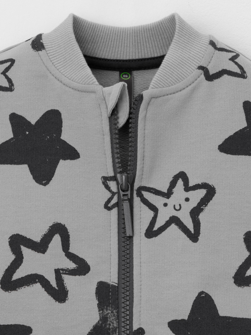 Трикотажный бомбер для мальчика. Изготовлен из мягкого петельчатого футера. Спереди удобная застёжка на молнию. Пояс, воротничок и манжеты выполнены из эластичного трикотажа. По бокам карманы. Изделие сохраняет цвет и форму после многократных стирок. Все трикотажные полотна производятся в соответствии с нормами швейцарского сертификата ЭкоТекс.