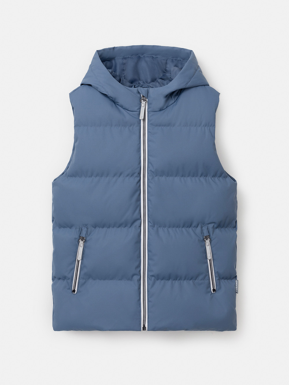 Стёганый жилет с капюшоном для мальчика с утеплителем, 120 г/м2. Выполнен из мембранной ткани с дополнительной тефлоновой обработкой. Данный вид обработки предохраняет изделие от загрязнения и лучше отводит влагу. Подклад из 100% полиэстра. Капюшон не снимается. Изделие застёгивается на молнию, предусмотрена защита подбородка. Два кармана по бокам застёгиваются на молнии. Во всех изделиях верхнего ассортимента для безопасности ребёнка предусмотрены светоотражающие элементы.