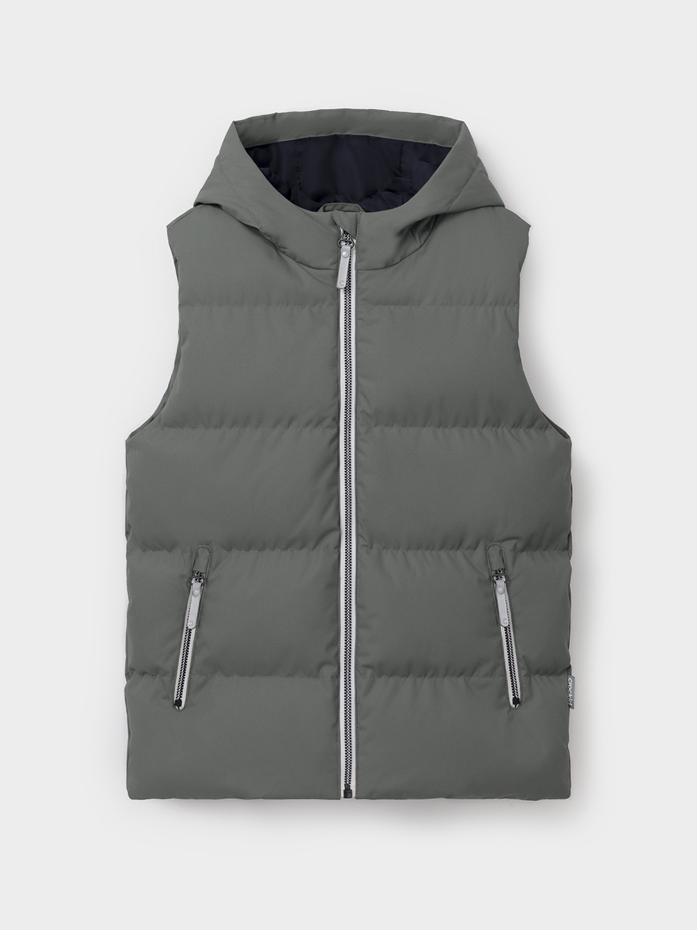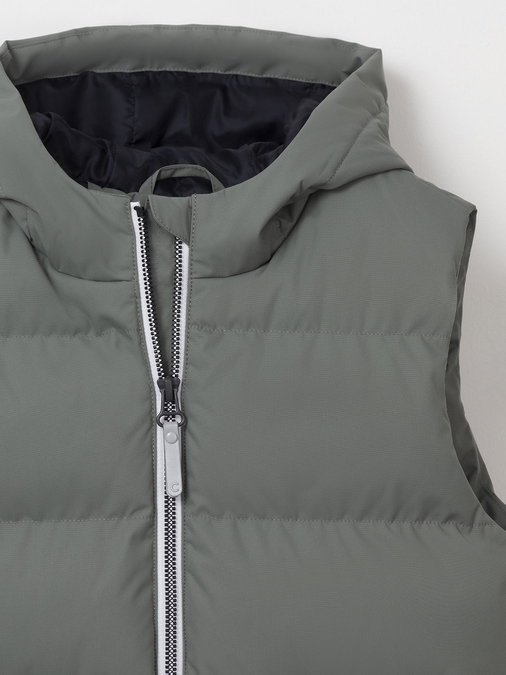 Стёганый жилет с капюшоном для мальчика с утеплителем, 120 г/м2. Выполнен из мембранной ткани с дополнительной тефлоновой обработкой. Данный вид обработки предохраняет изделие от загрязнения и лучше отводит влагу. Подклад из 100% полиэстра. Капюшон не снимается. Изделие застёгивается на молнию, предусмотрена защита подбородка. Два кармана по бокам застёгиваются на молнии. Во всех изделиях верхнего ассортимента для безопасности ребёнка предусмотрены светоотражающие элементы.