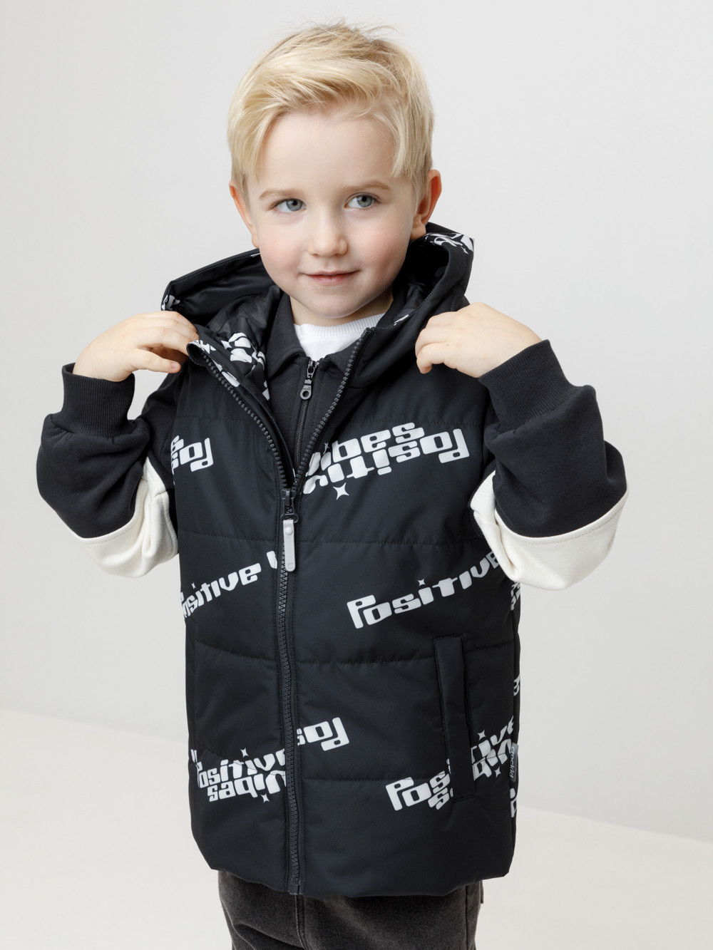 Стёганый жилет с капюшоном для мальчика с утеплителем Fellex®, 120 г/м2. Выполнен из мембранной ткани с дополнительной тефлоновой обработкой. Данный вид обработки предохраняет изделие от загрязнения и лучше отводит влагу. Подклад из 100% полиэстра. Капюшон не снимается. Изделие застёгивается на молнию, предусмотрена защита подбородка. Два кармана без застёжек. Во всех изделиях верхнего ассортимента для безопасности ребёнка предусмотрены светоотражающие элементы.