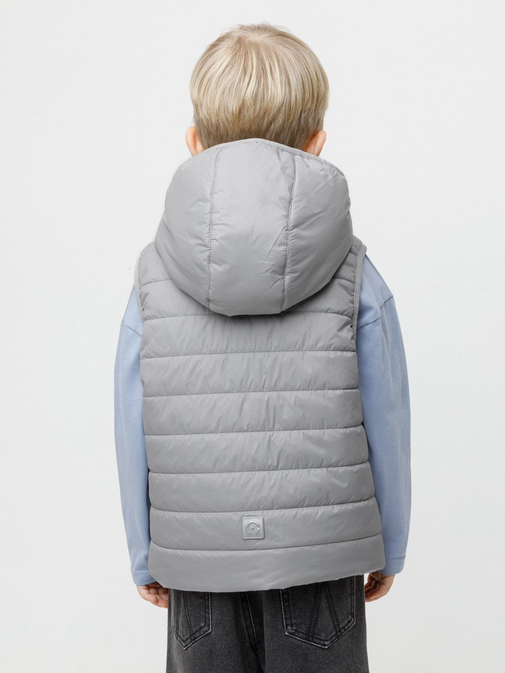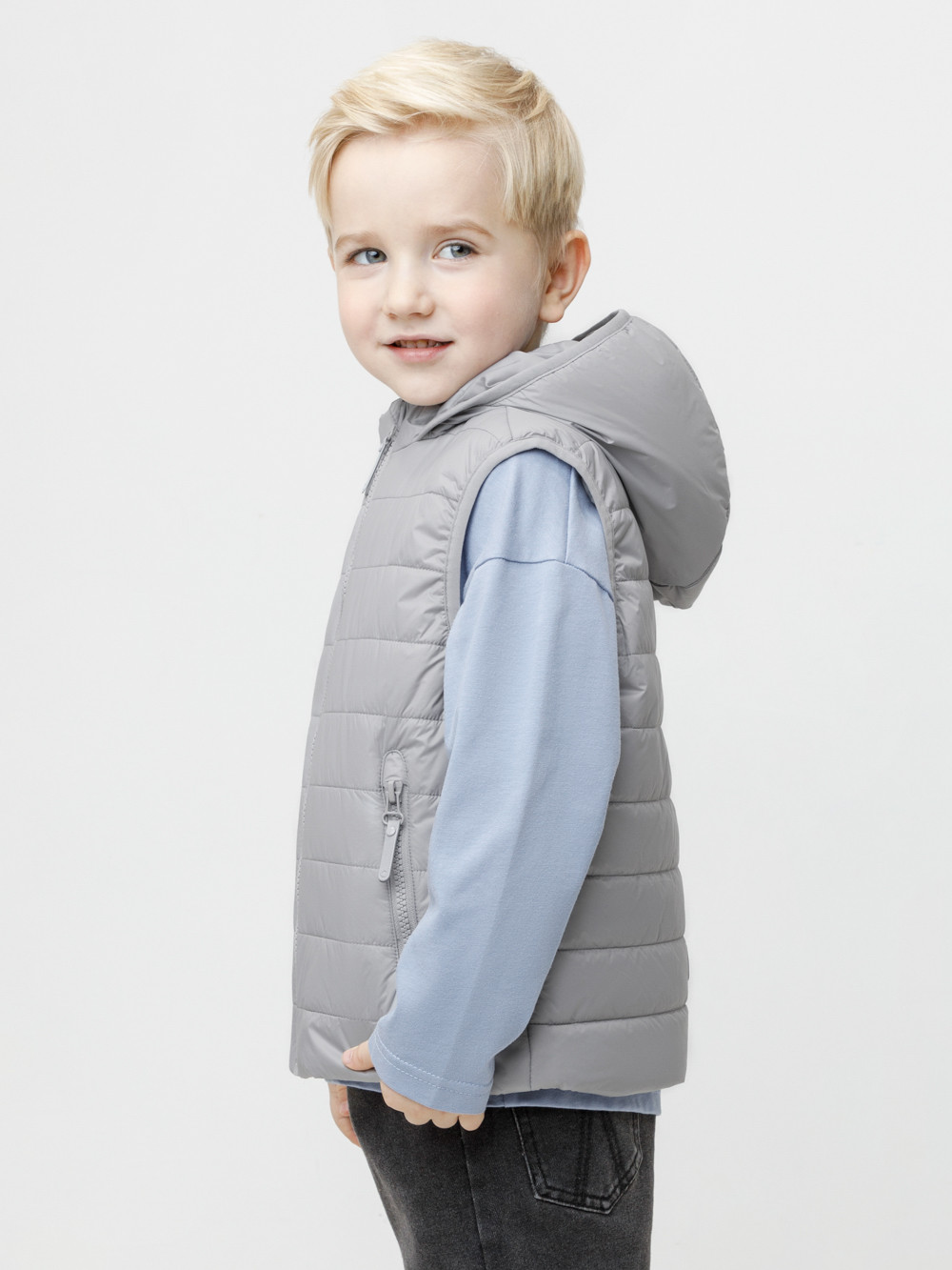 Стёганый жилет с капюшоном для мальчика с утеплителем Fellex®, 120 г/м2. Выполнен из мембранной ткани с дополнительной тефлоновой обработкой. Данный вид обработки предохраняет изделие от загрязнения и лучше отводит влагу. Подклад из хлопка в размерах 86-92 и 92-98 и из полиэстера в размерах от 98-104 до 122-128. Капюшон не снимается. По краю капюшона и проймам обработка эластичным кантом для лучшего прилегания. Изделие застёгивается на молнию, предусмотрена защита подбородка. Два кармана по бокам на молниях. Во всех изделиях верхнего ассортимента для безопасности ребёнка предусмотрены светоотражающие элементы.