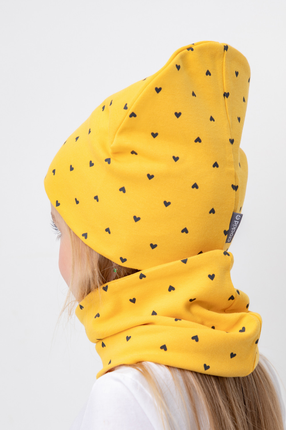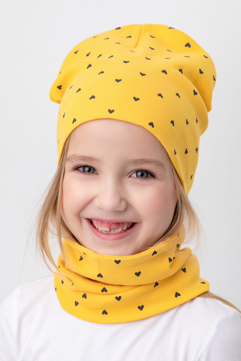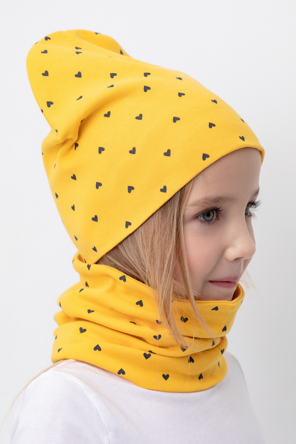 Комплект для девочки - шапка и снуд из набивного трикотажа рибана с эластаном. Шапка с удлинённой скругленной макушкой, украшена жаккардовой нашивкой. Снуд сплошной.