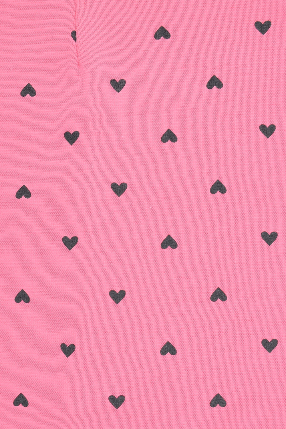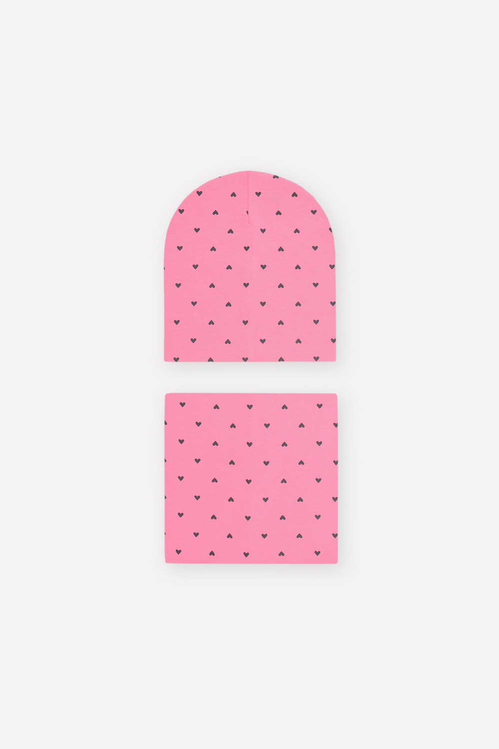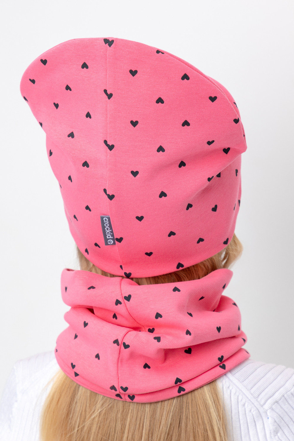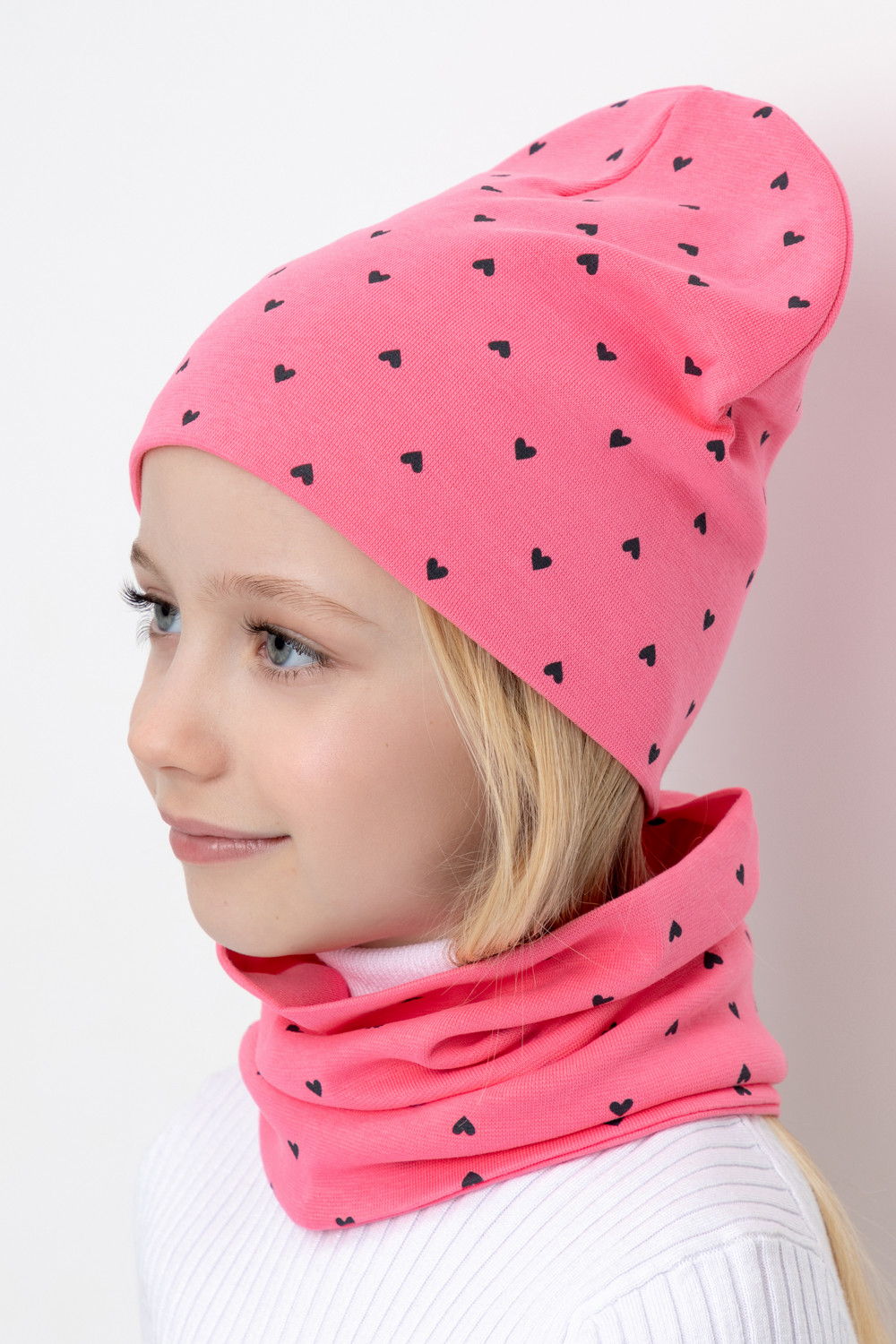 Комплект для девочки - шапка и снуд из трикотажа рибана с эластаном. Шапка с удлинённой скругленной макушкой. Снуд сплошной. Украшены набивным рисунком с изображением сердечек и жаккардовыми нашивками.