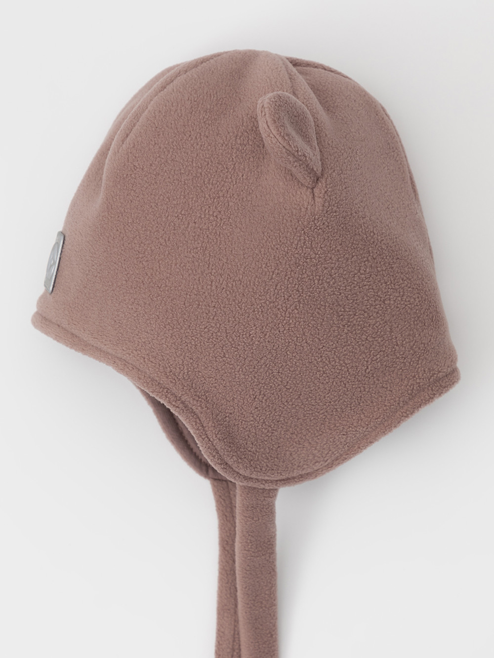 Флисовая шапка на завязках с мягким подкладом из натурального хлопка. Сверху украшена декоративными ушками из флиса. Спереди прикреплён светоотражатель, который обеспечивает дополнительную безопасность в тёмное время суток. Шапка сохраняет цвет и форму после многократных стирок.