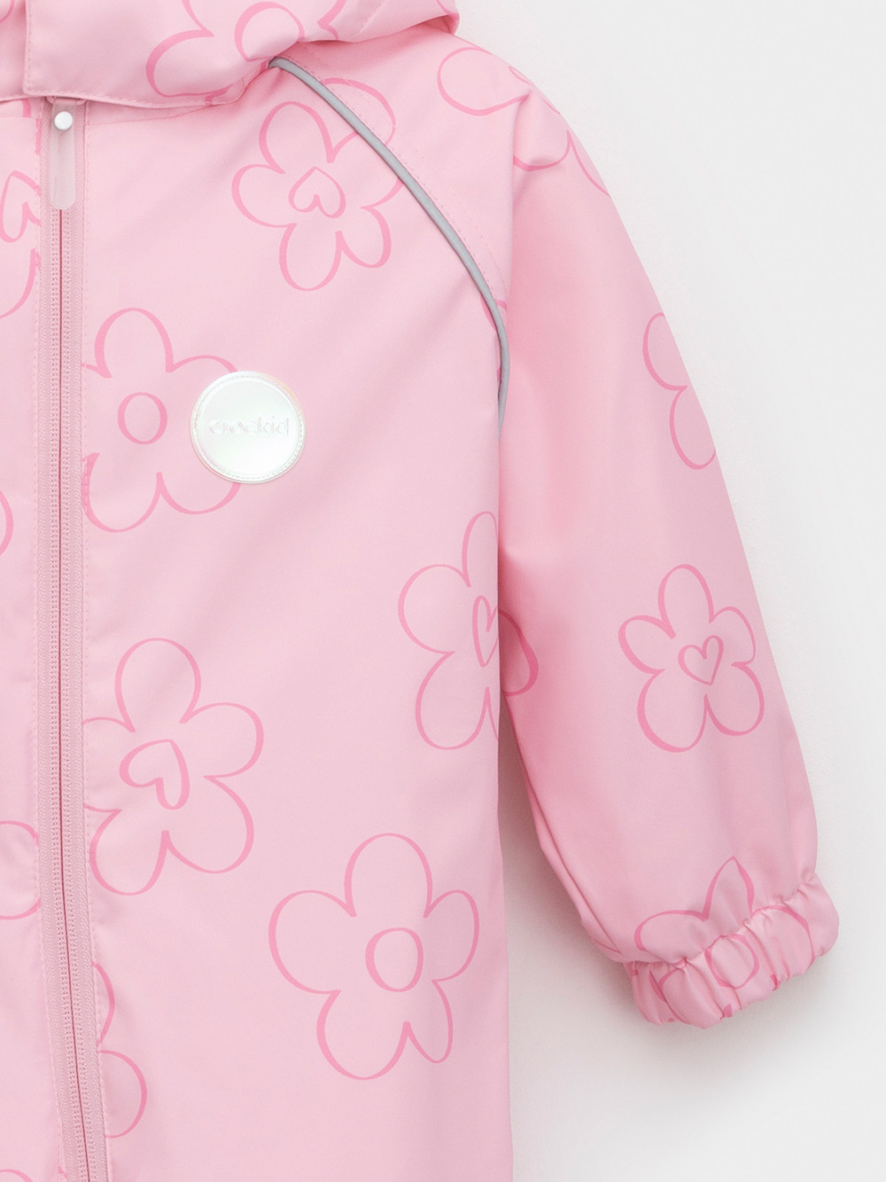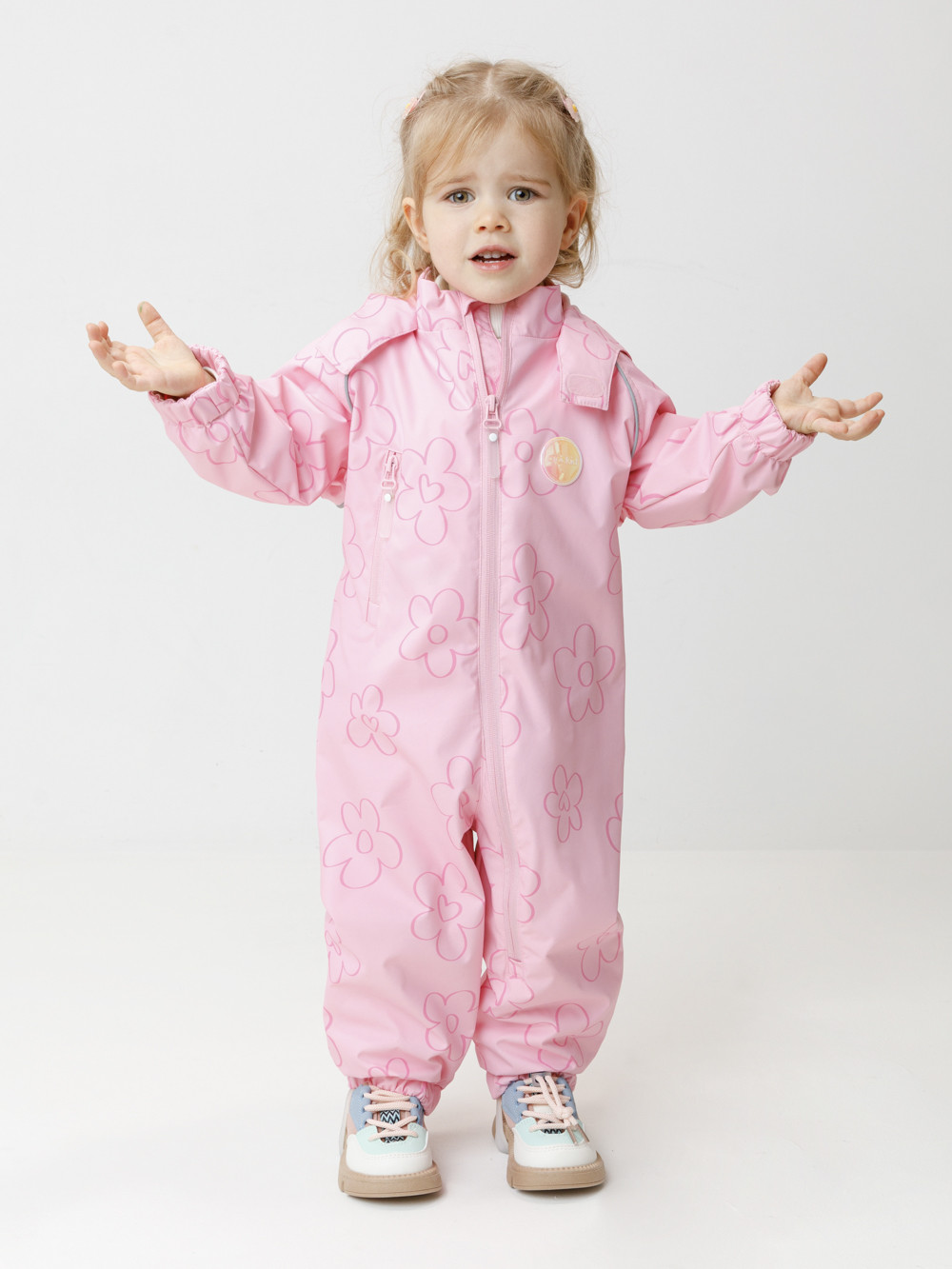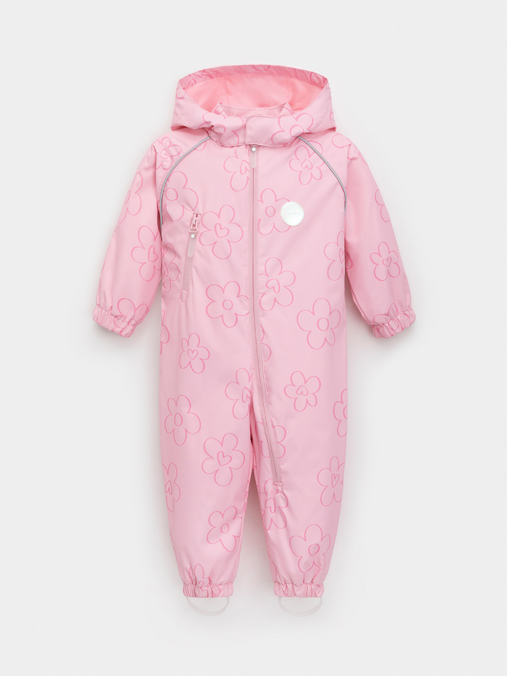Ветровочный комбинезон ясельный без утеплителя. Выполнен из мембранной ткани с дополнительной тефлоновой обработкой. Данный вид обработки предохраняет изделие от загрязнения и лучше отводит влагу. Подклад из 100% хлопка. Для удобного одевания комбинезон застёгивается на удлинённую молнию с защитой подбородка. Утяжка на капюшоне с потайным стоппером. По низу рукавов и брючин, а также на спинке изделия предусмотрены эластичные резинки для лучшего прилегания. Для фиксации комбинезона используются съёмные силиконовые штрипки. В размерах 68-74 и 74-80 есть функциональные отвороты на рукавах и брючинах. Во всех изделиях верхнего ассортимента для безопасности ребёнка предусмотрены светоотражающие элементы.