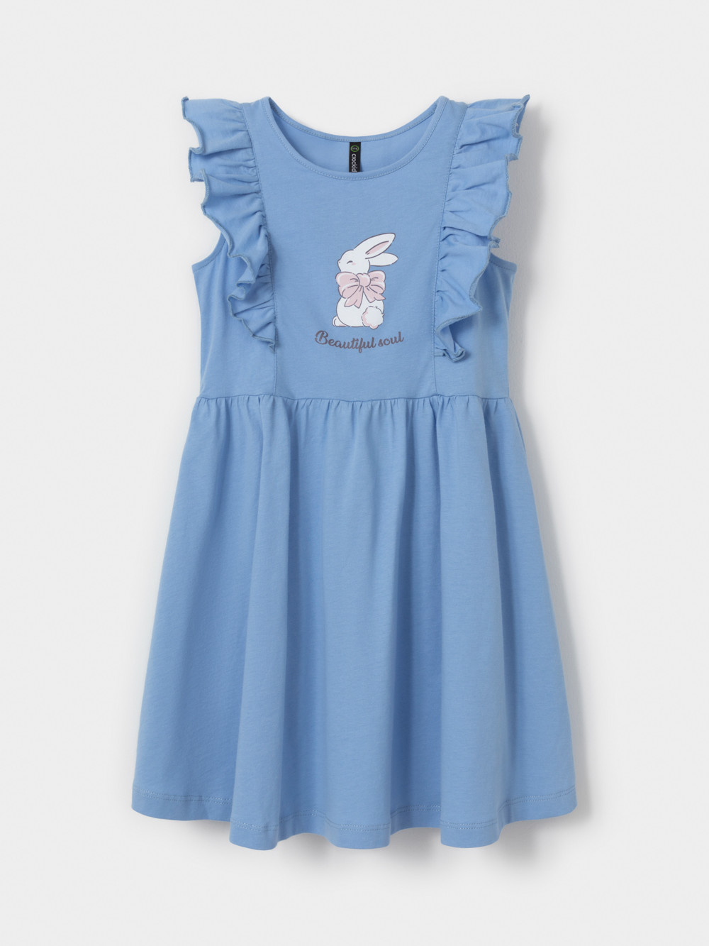 Лёгкое платье с оборками для девочки. Изготовлено из гладкого трикотажа супрем, который произведён из 100% натурального хлопка высокого качества. Изделие отлично дышит, поэтому идеально подходит на каждый день. Оригинальный принт выполнен из стойких текстильных гипоаллергенных красителей. Платье сохраняет форму и стойкий цвет после многочисленных стирок. Все трикотажные полотна производятся в соответствии с нормами швейцарского сертификата ЭкоТекс.