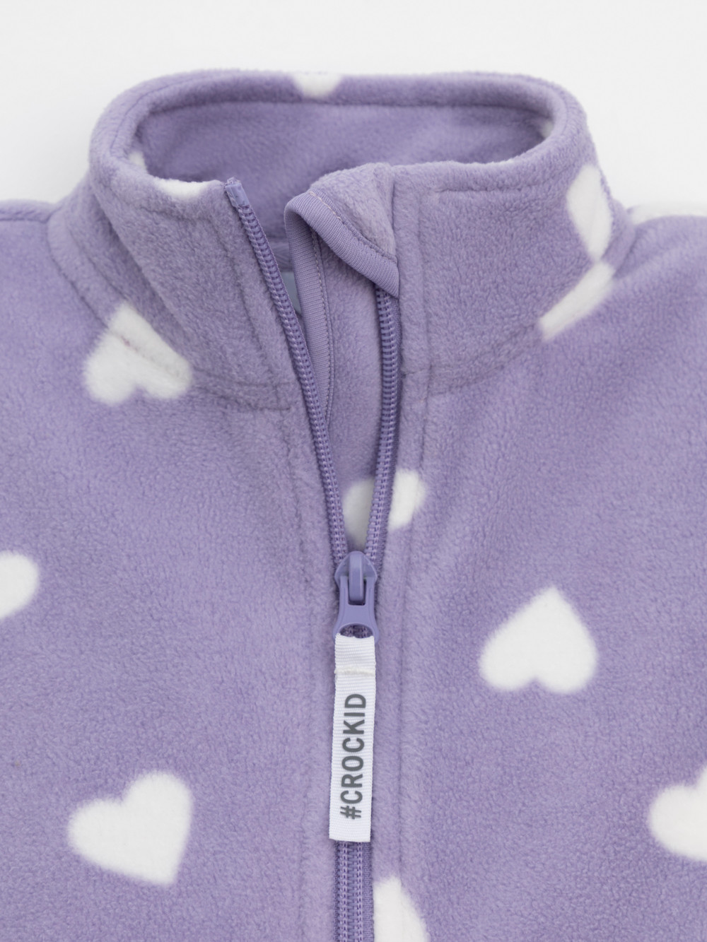 Флисовая куртка для девочки. У изделия высокий воротник и застёжка на молнию с мягкой защитой шеи и подбородка. По бокам два кармана. Оригинальная набивка выполнена из стойких гипоаллергенных текстильных красителей. Куртка сохраняет цвет и форму после многократных стирок.