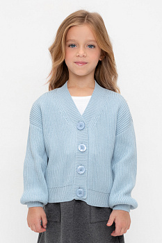 Вязаный кардиган для девочки со спущенными рукавами. Связан из хлопковой пряжи. На рукавах эластичные манжеты. Внизу мягкий пояс. Застёгивается на пуговицы.