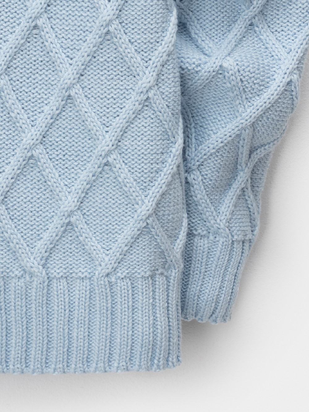 Вязаный кардиган для девочки. Изготовлен из мягкой хлопковой пряжи с добавлением акрила. Застёгивается на планку с пуговицами. Длинные рукава с манжетами. Внизу эластичный пояс. Изделие сохраняет форму и стойкий цвет после многочисленных стирок.