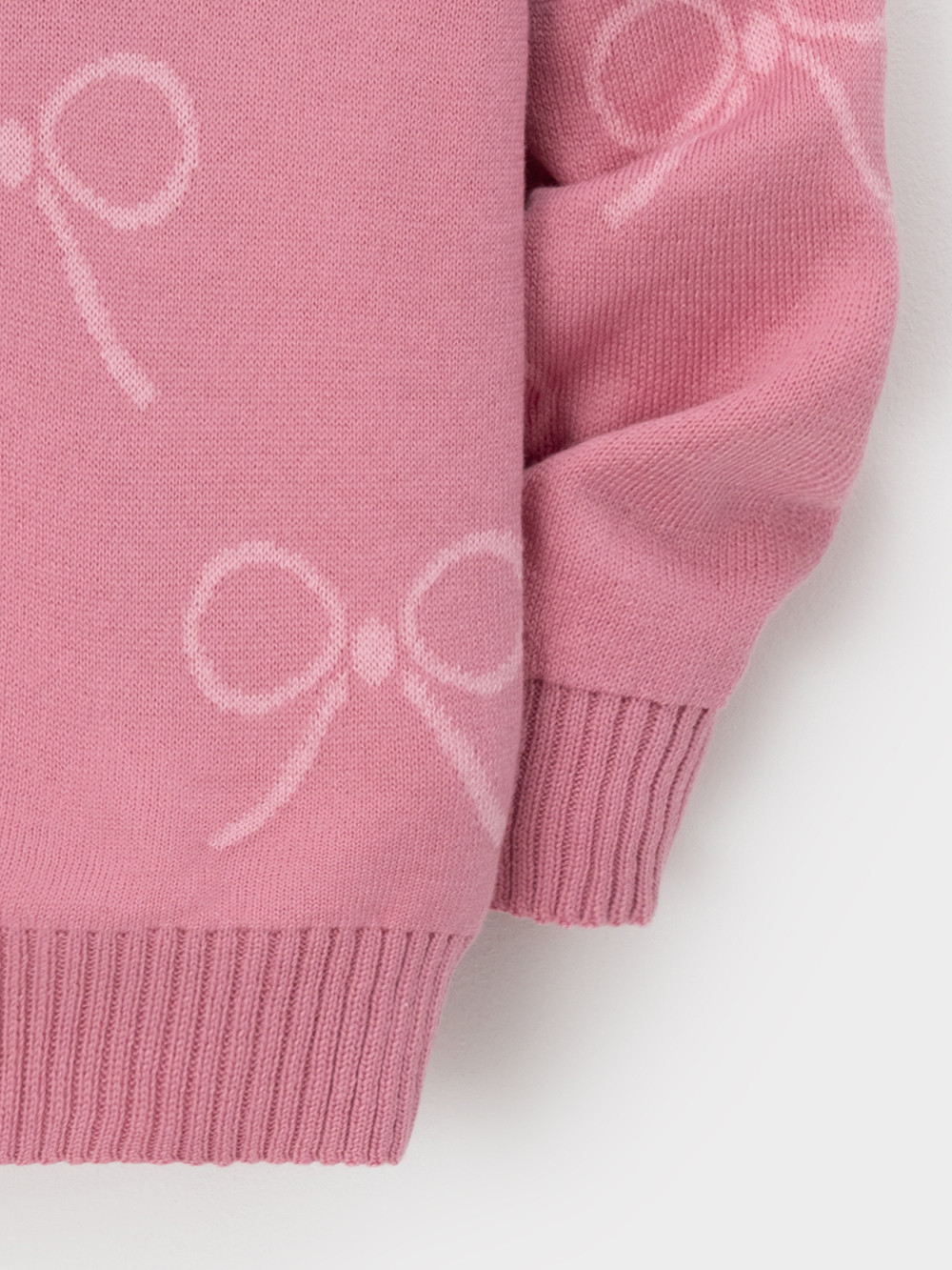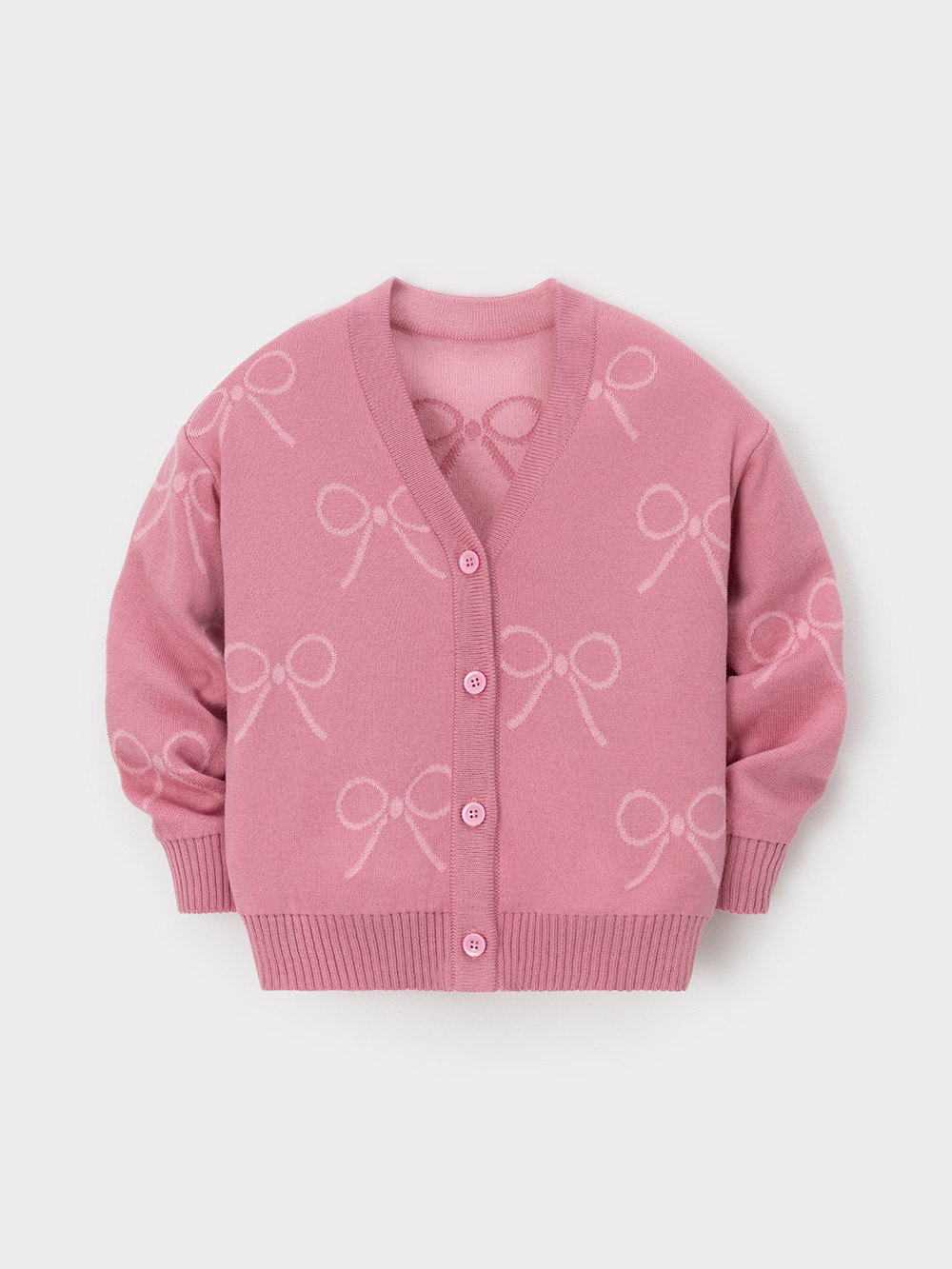 Вязаный кардиган с бантиками для девочки. Изготовлен из мягкой хлопковой пряжи с добавлением акрила. Застёгивается на планку с пуговицами. Длинные рукава с манжетами. Внизу эластичный пояс. Изделие сохраняет форму и стойкий цвет после многочисленных стирок.