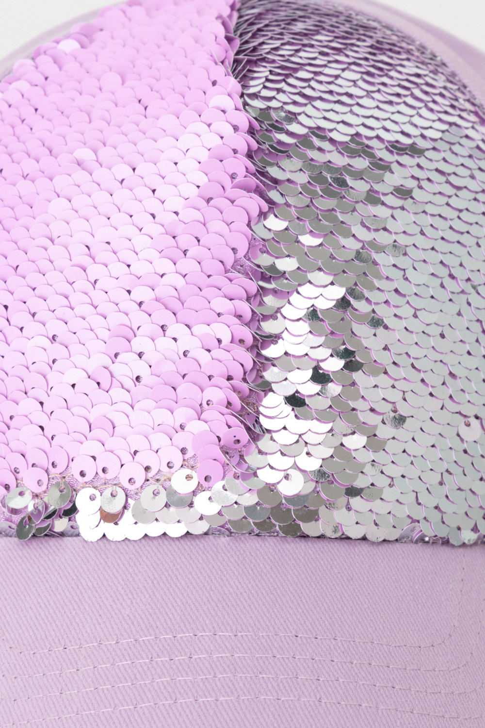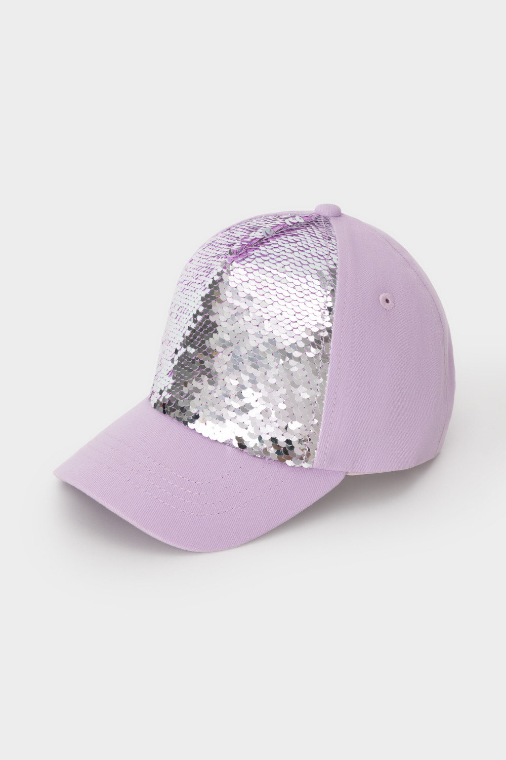 Кепка для девочки из натурального хлопка. Спереди украшена пайетками. Регулируется по ширине головы и фиксируется на затылке с помощью металлического зажима.