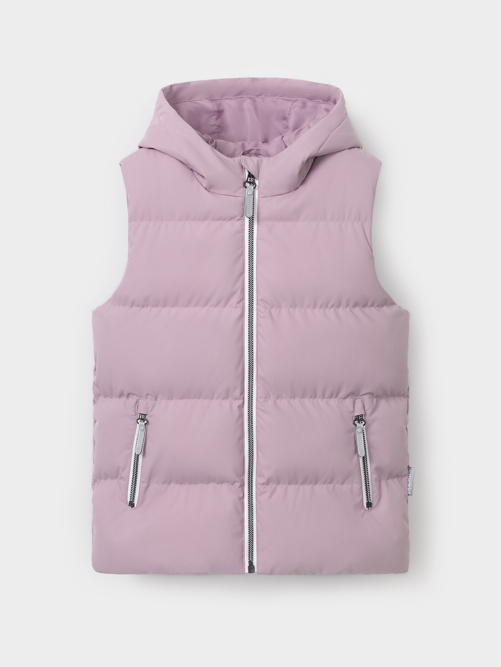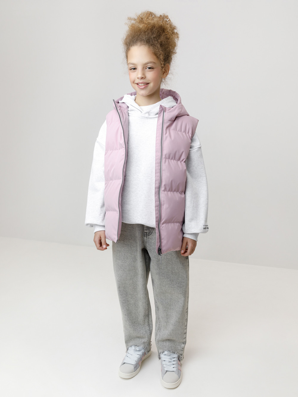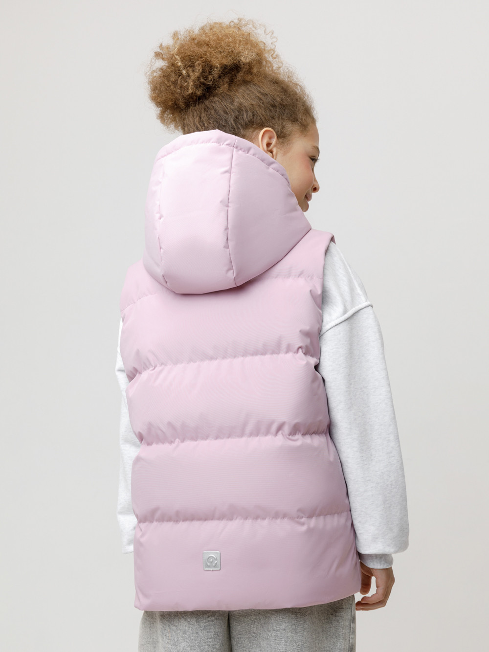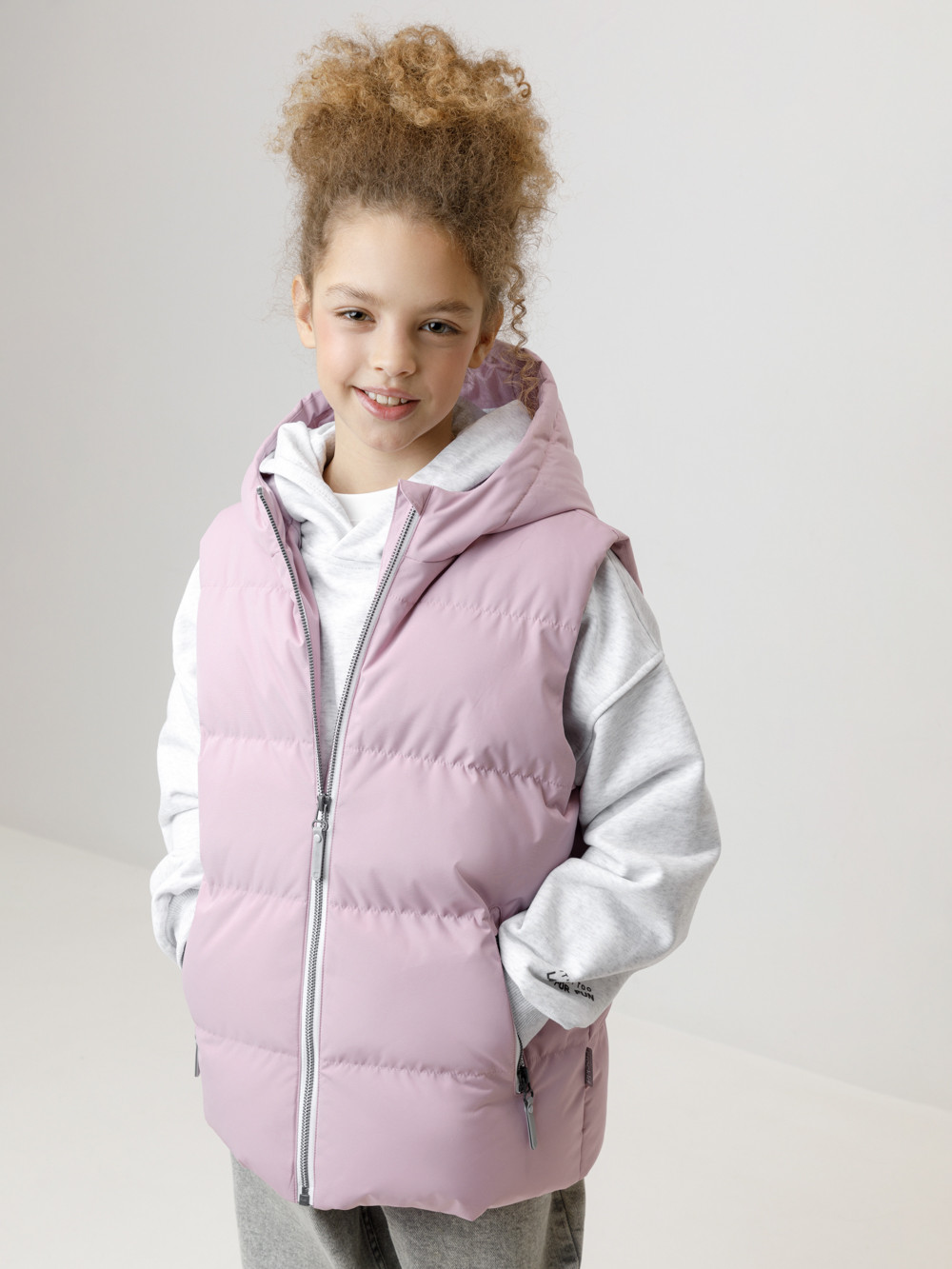 Стёганый жилет с капюшоном для девочки с утеплителем, 120 г/м2. Выполнен из мембранной ткани с дополнительной тефлоновой обработкой. Данный вид обработки предохраняет изделие от загрязнения и лучше отводит влагу. Подклад из 100% полиэстра. Капюшон не снимается. Изделие застёгивается на молнию, предусмотрена защита подбородка. Два кармана по бокам застёгиваются на молнии. Во всех изделиях верхнего ассортимента для безопасности ребёнка предусмотрены светоотражающие элементы.