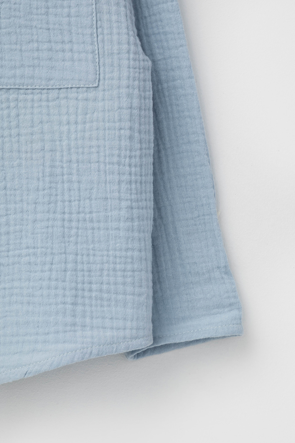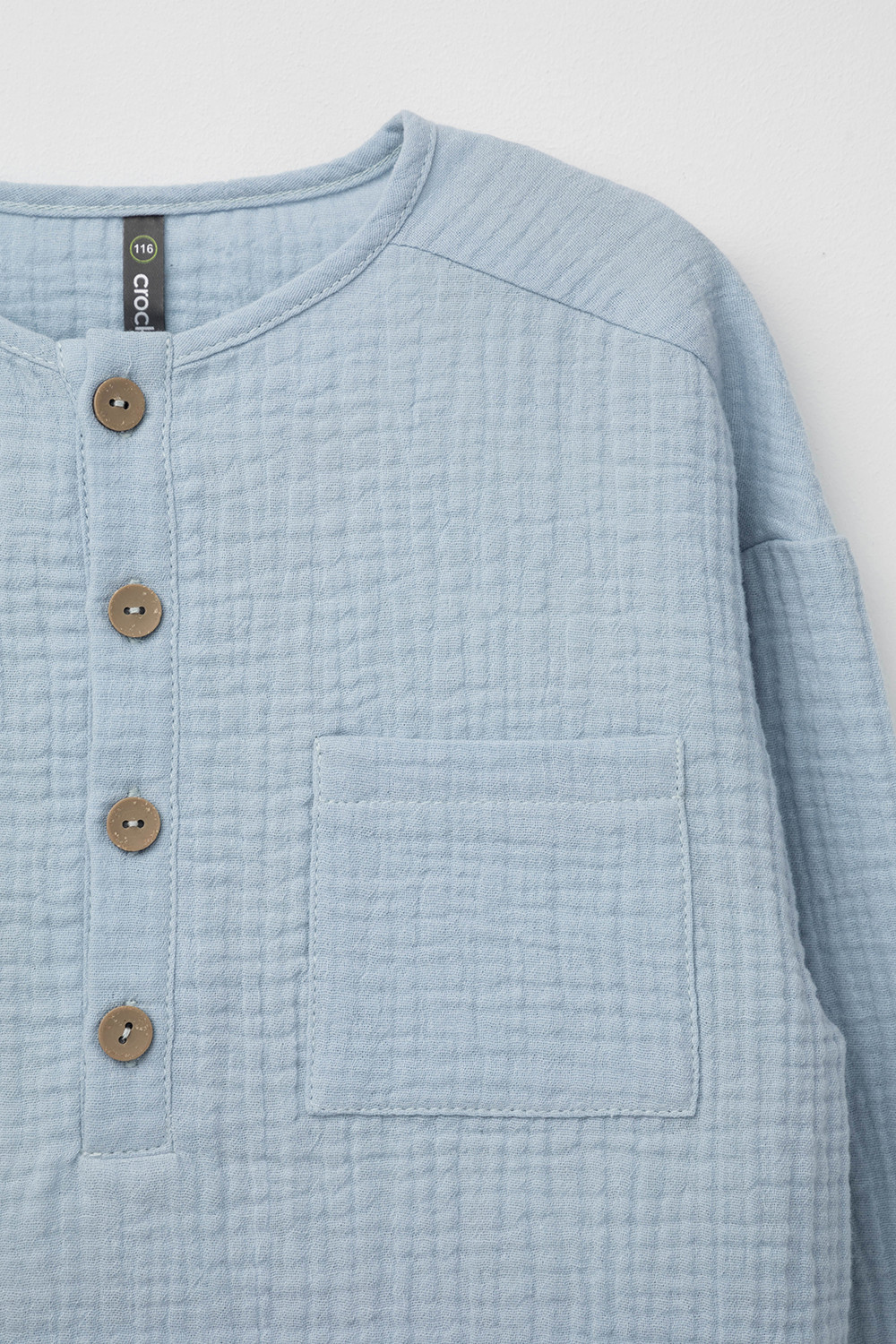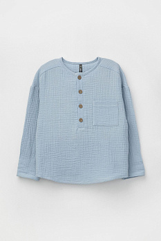 Легкая детская рубашка свободного кроя из мягкого хлопокового муслина, слегка спущенной линией плеча, длинными рукавами и с застежкой на пуговицы. Изделие сохраняет цвет, форму и фактуру жатости после многократных стирок.