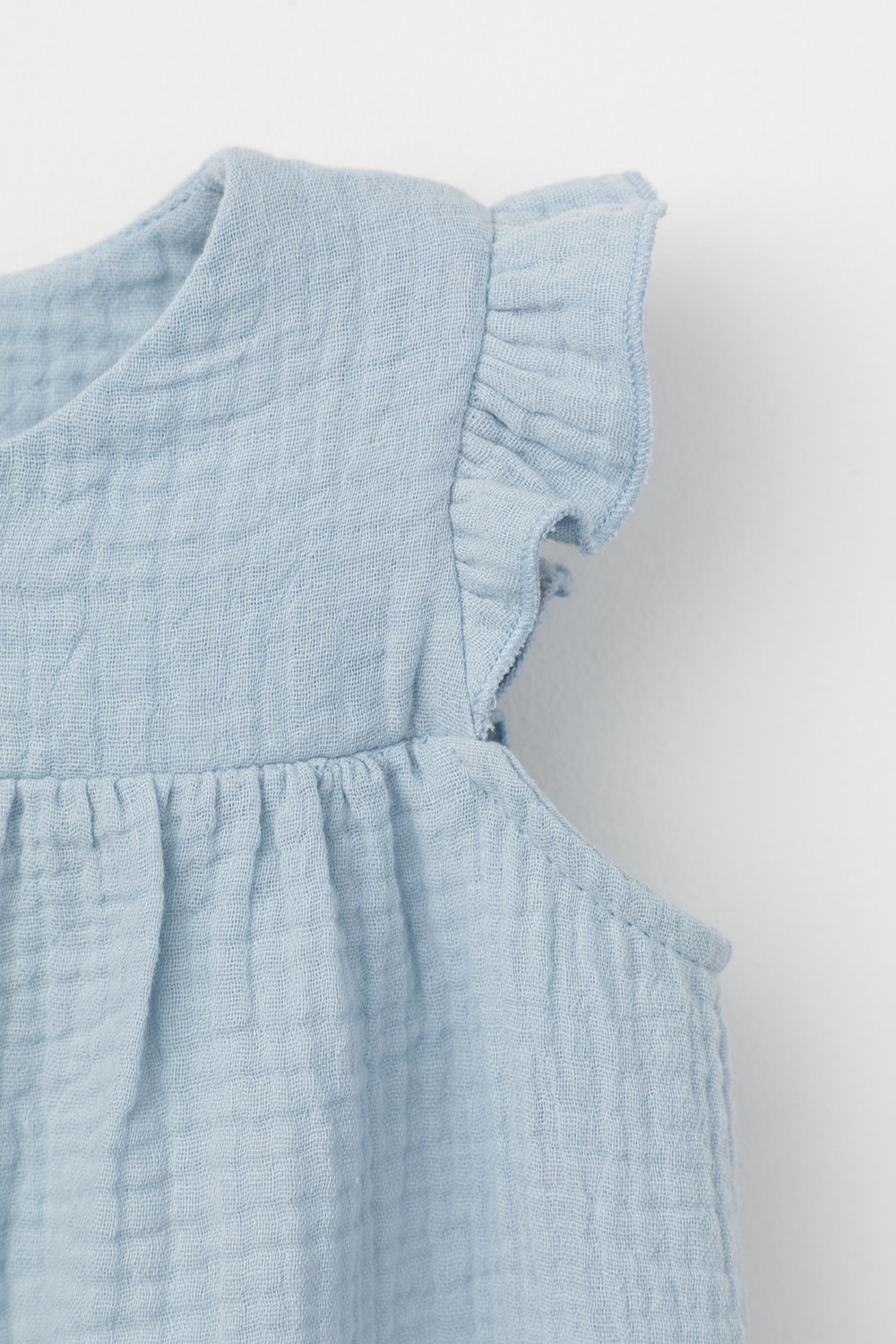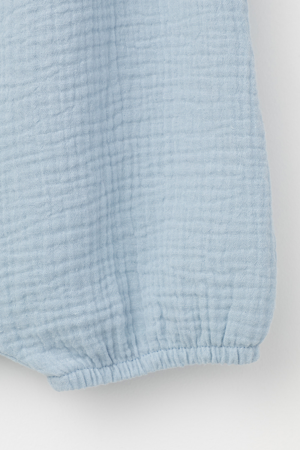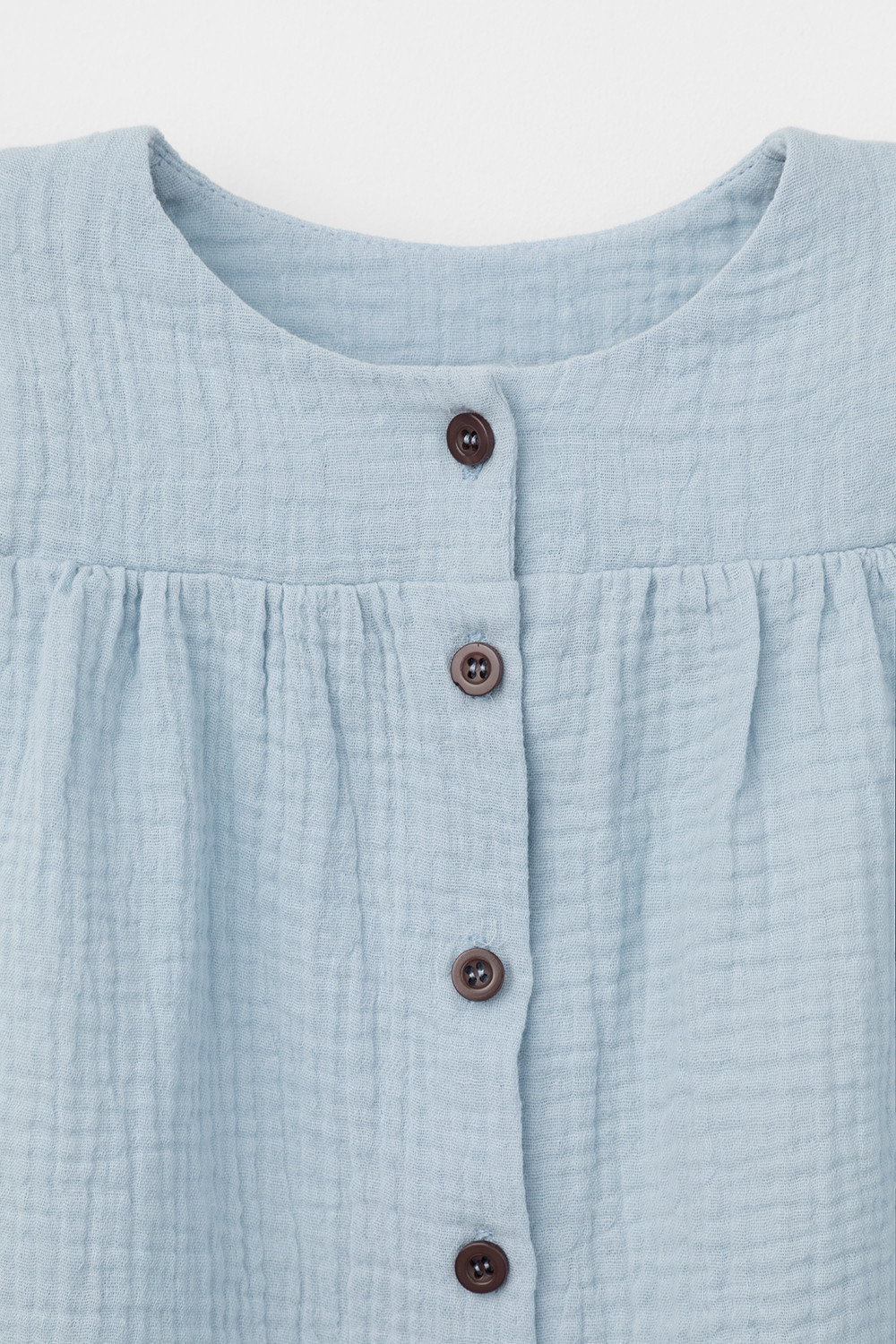 Легкий песочник для девочки из мягкого хлопокового муслина с застежкой на пуговицы. Изделие сохраняет цвет, форму и фактуру жатости после многократных стирок.
