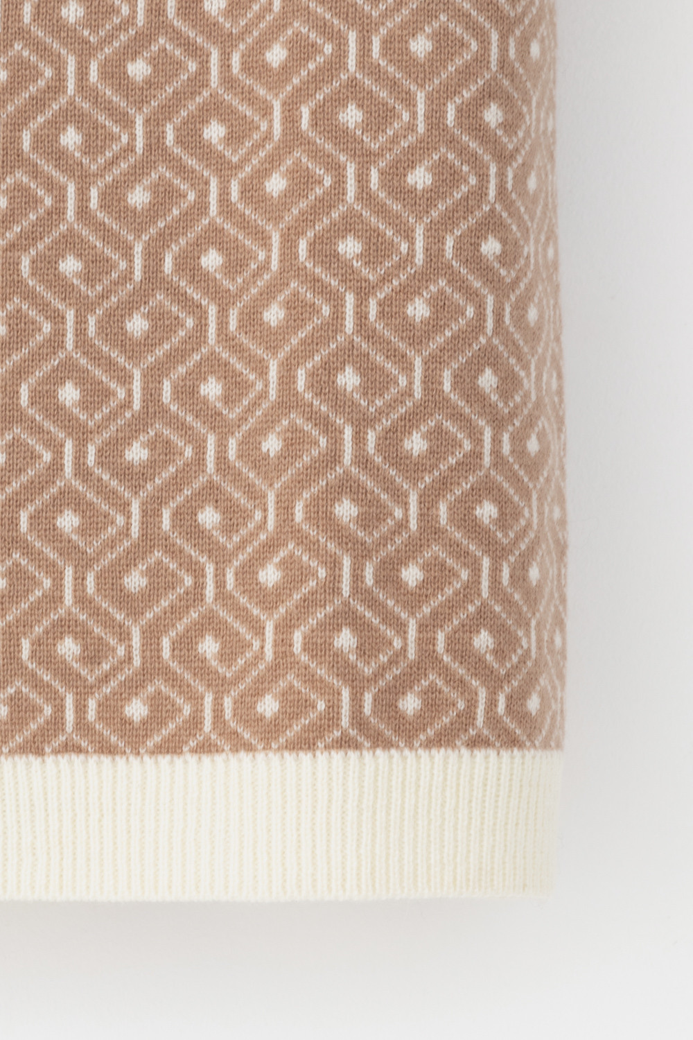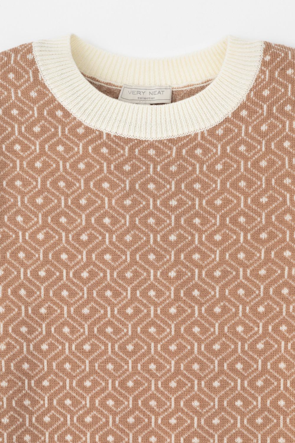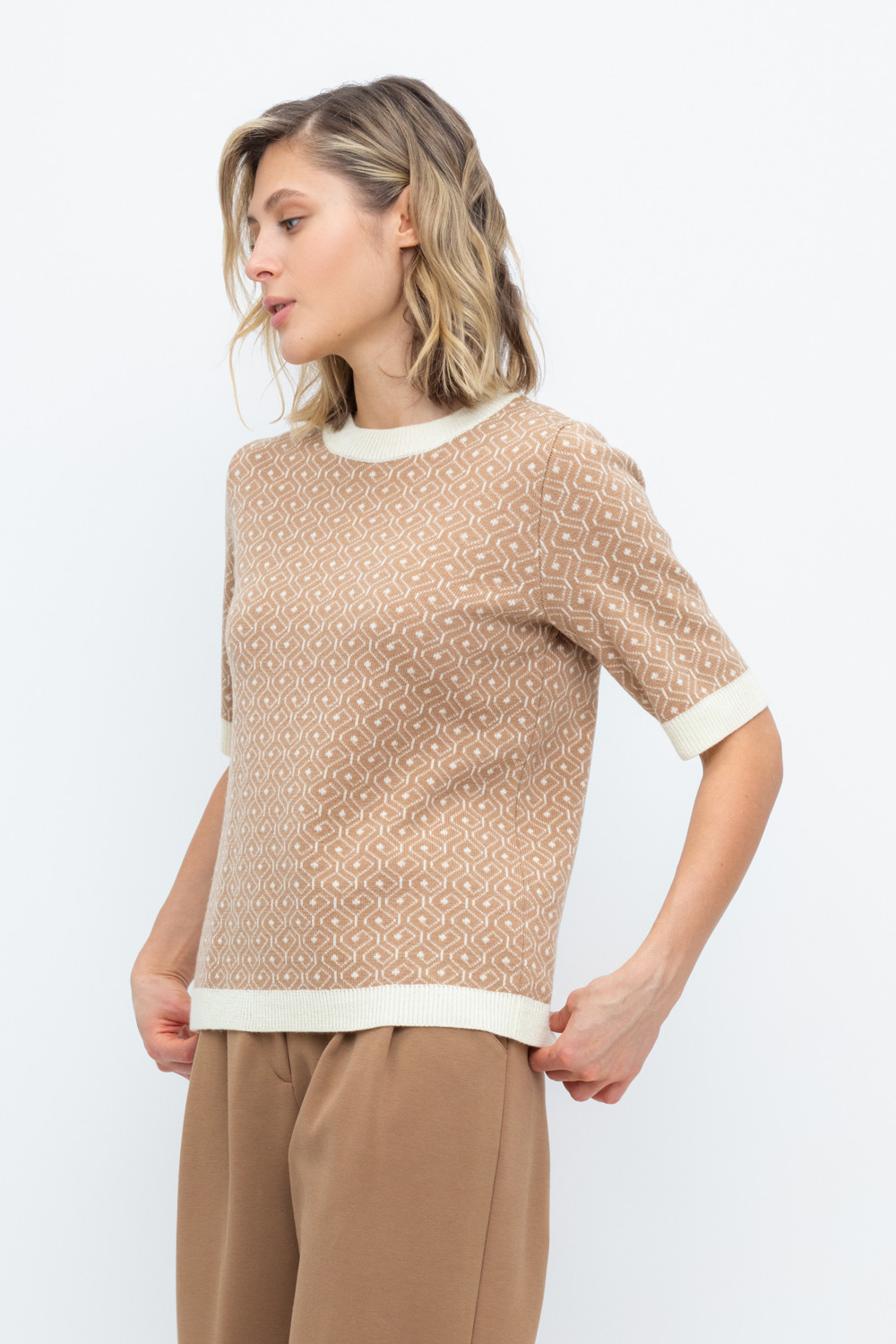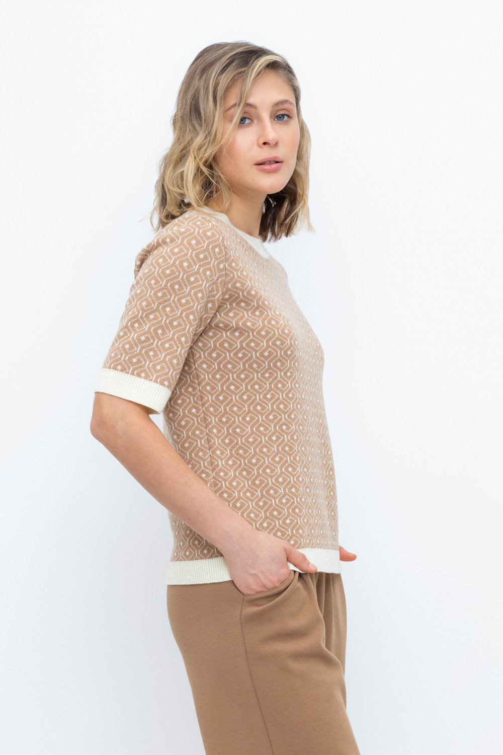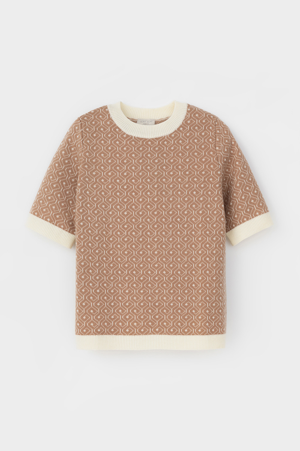 Джемпер в стиле прямой футболки с короткими рукавами. Прямой силуэт, стандартная длина. Выполнен жаккардом из мягкой полушерстяной пряжи. Шерсть мериноса в составе сохраняет тепло, а благодаря волокнам акрила изделие мягкое и дольше сохраняет форму.