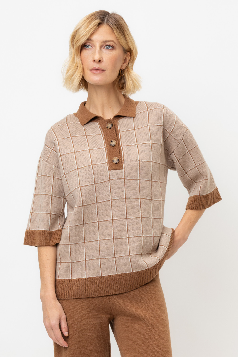 Поло свободного силуэта с короткими рукавами из полушерстяной пряжи. Связано жаккардом, манжеты и низ изделия хорошо держат форму благодаря вывязанной резинке. Спущенное плечо и прямой силуэт придают изделию свободный объем.