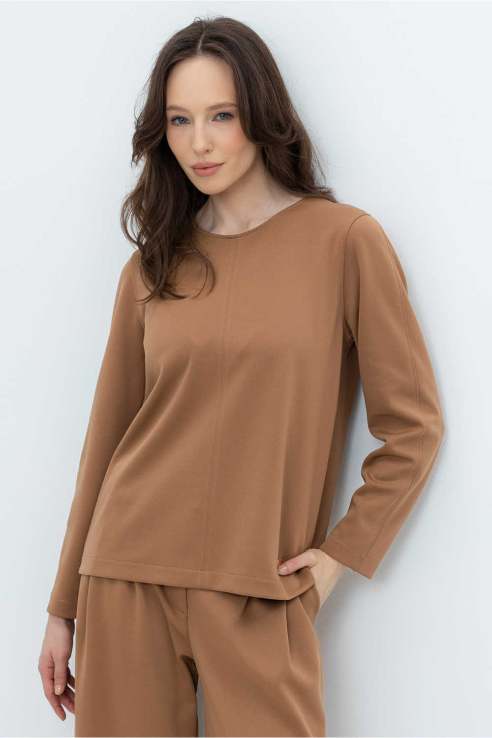Джемпер с длинными рукавами из плотного гладкого трикотажа интерлок.