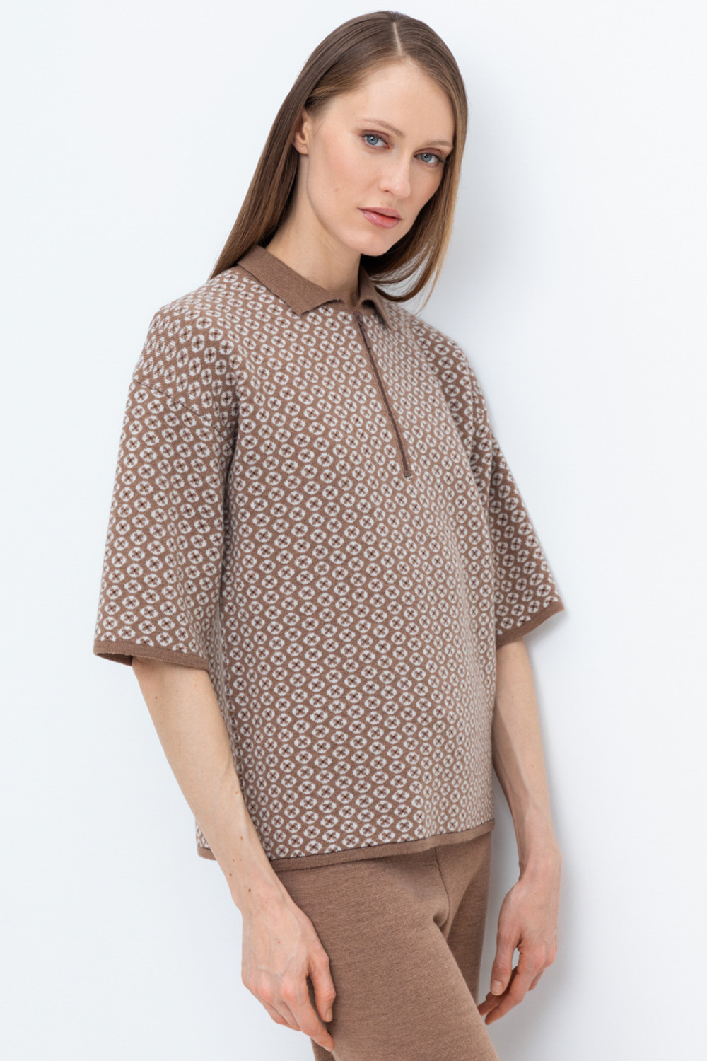 Поло свободного силуэта с короткими рукавами из полушерстяной пряжи. Связано жаккардом. Спущенное плечо и прямой силуэт придают изделию свободный объем.