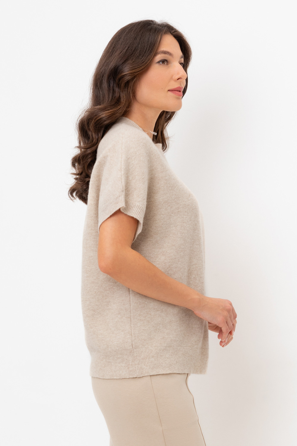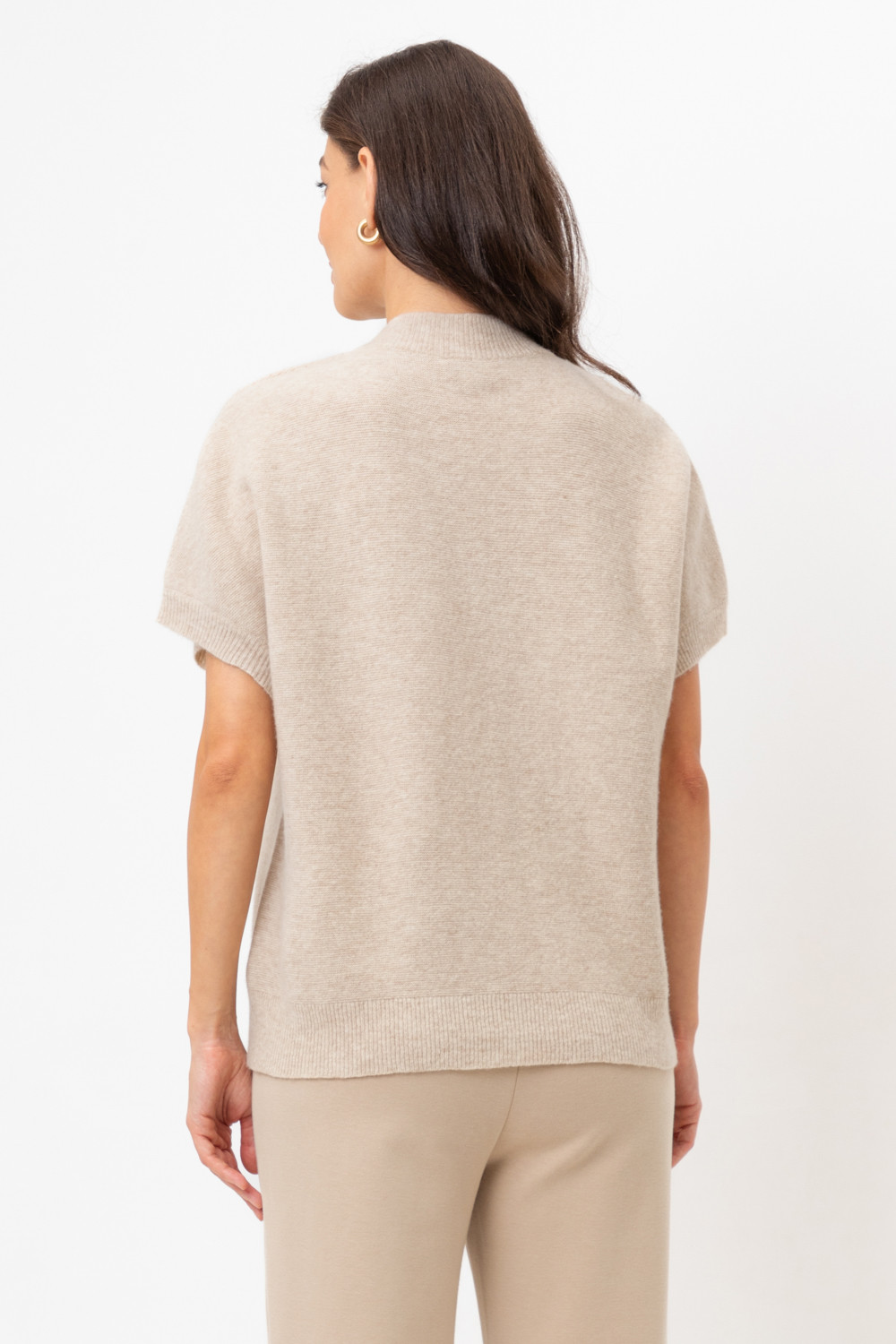 Уютный вязаный джемпер с короткими рукавами из шерсти. Комфортная посадка и цельнокроенные рукава придают изделию объем.