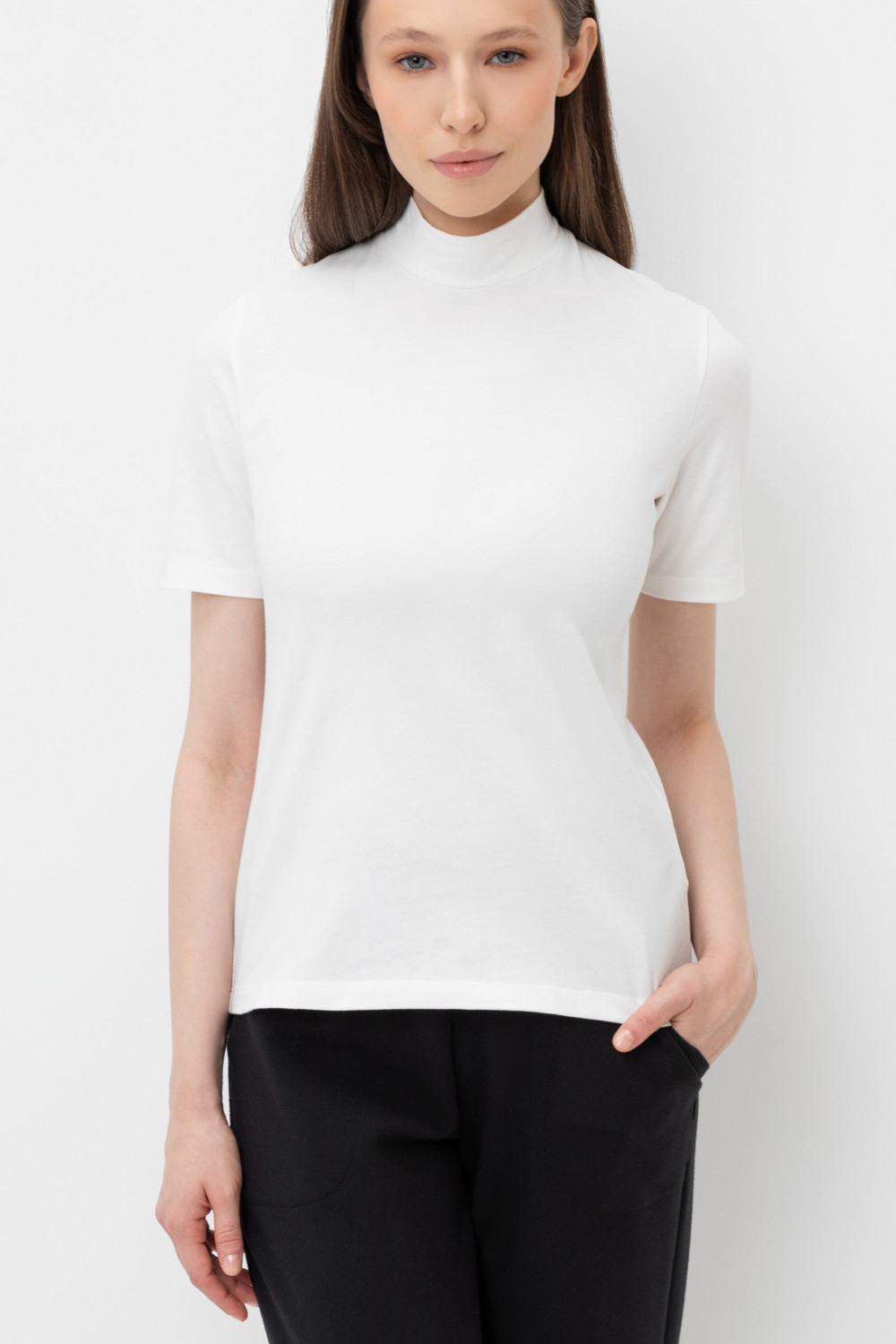 Базовый джемпер с короткими рукавами и воротником-стойкой из плотного однотонного трикотажа супрем с добавлением спандекса.