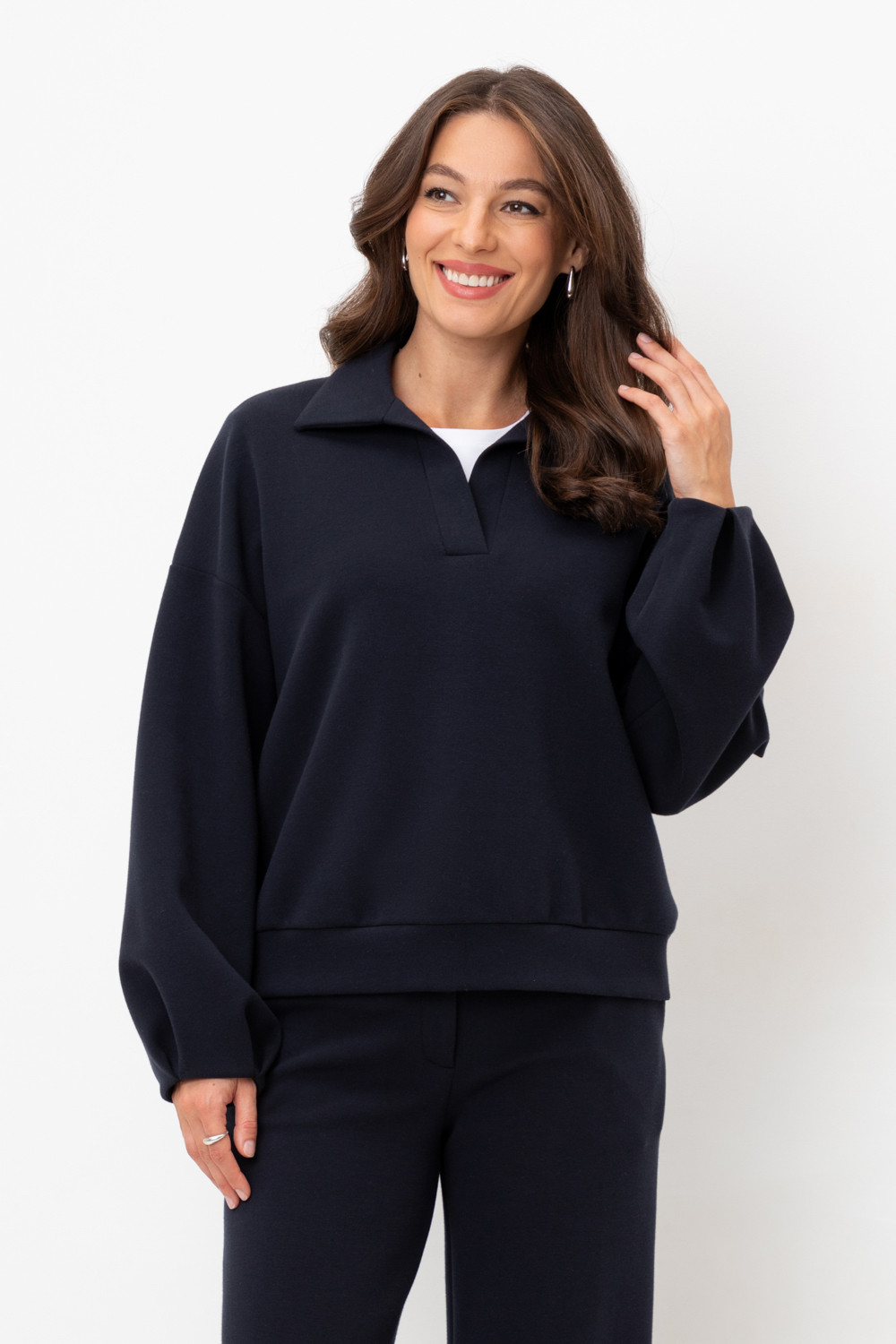 Джемпер с объемными рукавами из плотного трикотажа интерлок. Спущенное плечо и прямой силуэт придают изделию свободный объем.