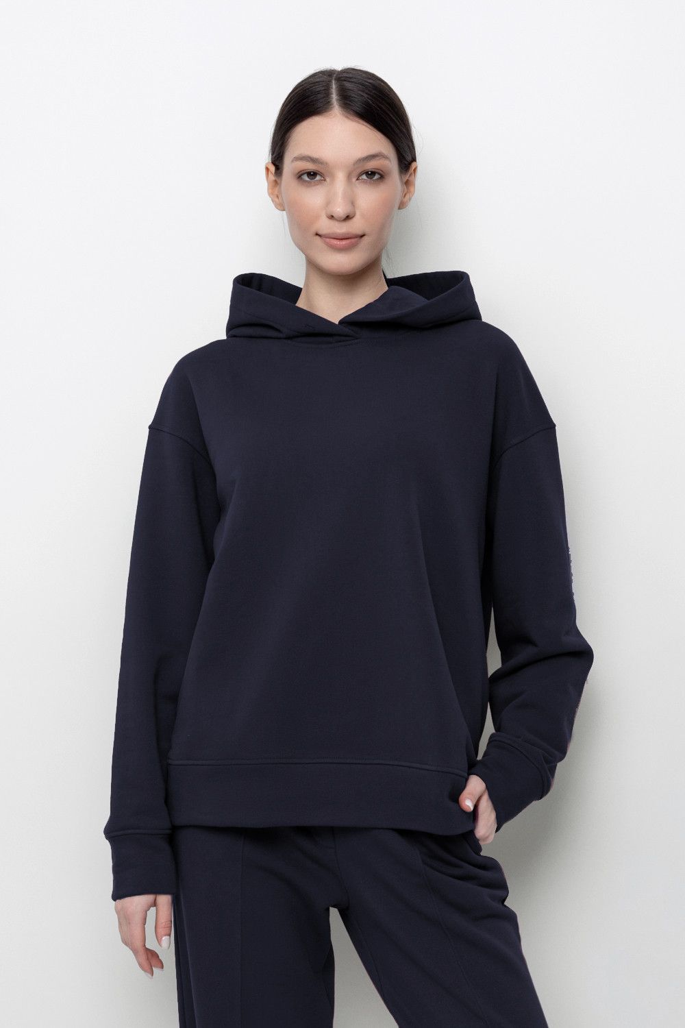 Толстовка с капюшоном и боковыми карманами из петельчатого футера трехнитки. В составе 80% натурального хлопка и 20% полиэстера, при этом полиэстер ввязан внутрь по особой технологии и не соприкасается с кожей. Спущенные рукава, манжеты из основного полотна. Свободный силуэт.