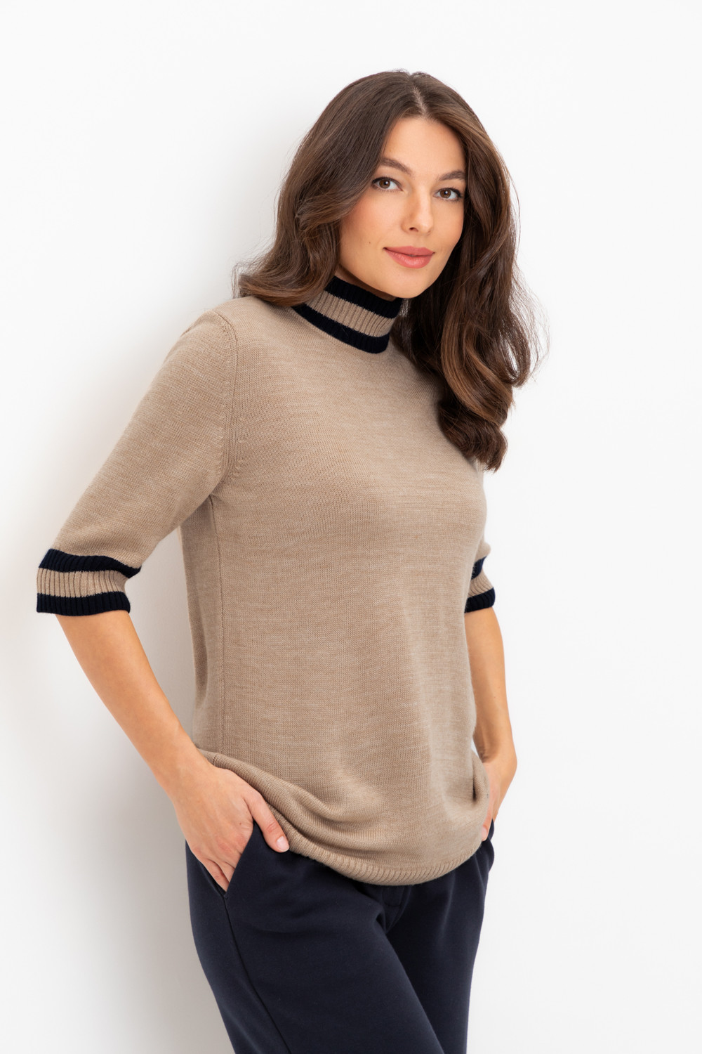 Джемпер в стиле прямой футболки, воротником-стойкой и короткими рукавами. Прямой силуэт, стандартная длина. Средняя плотность вязания, пластичная фактура. Выполнен гладью из мягкой полушерстяной пряжи. Шерсть в составе сохраняет тепло, а благодаря волокнам акрила изделие мягкое и дольше сохраняет форму.