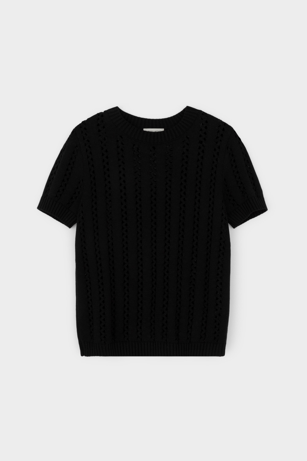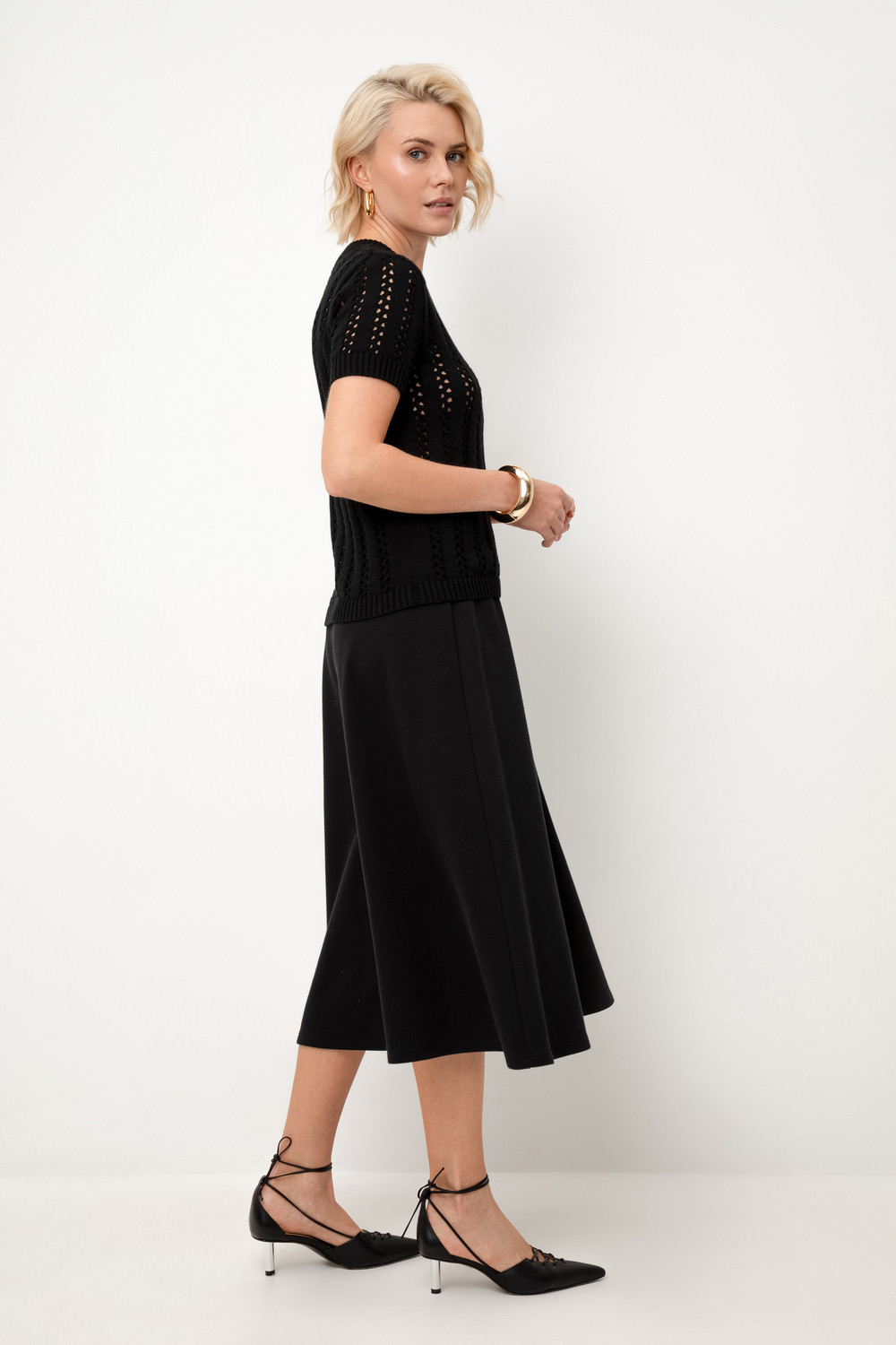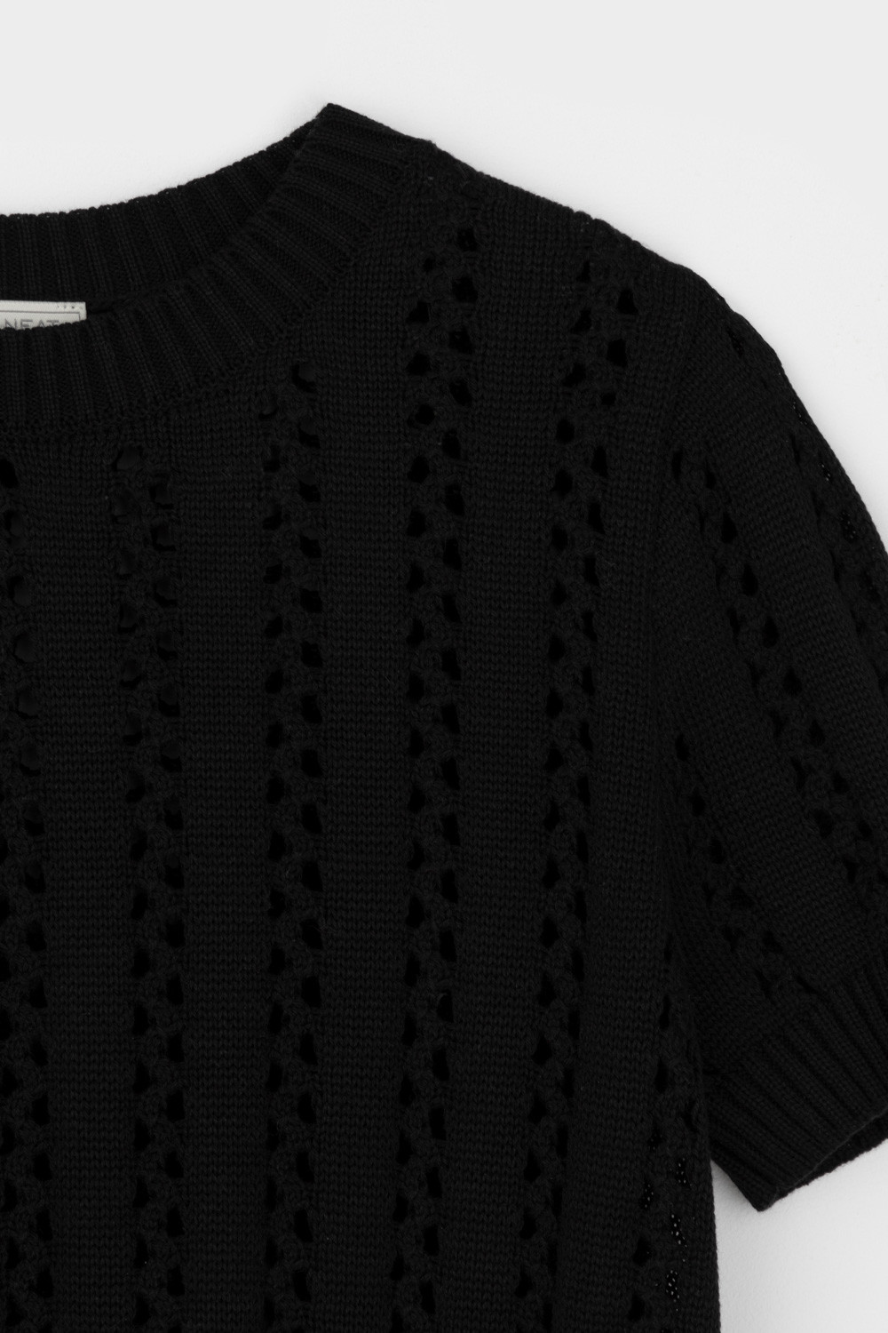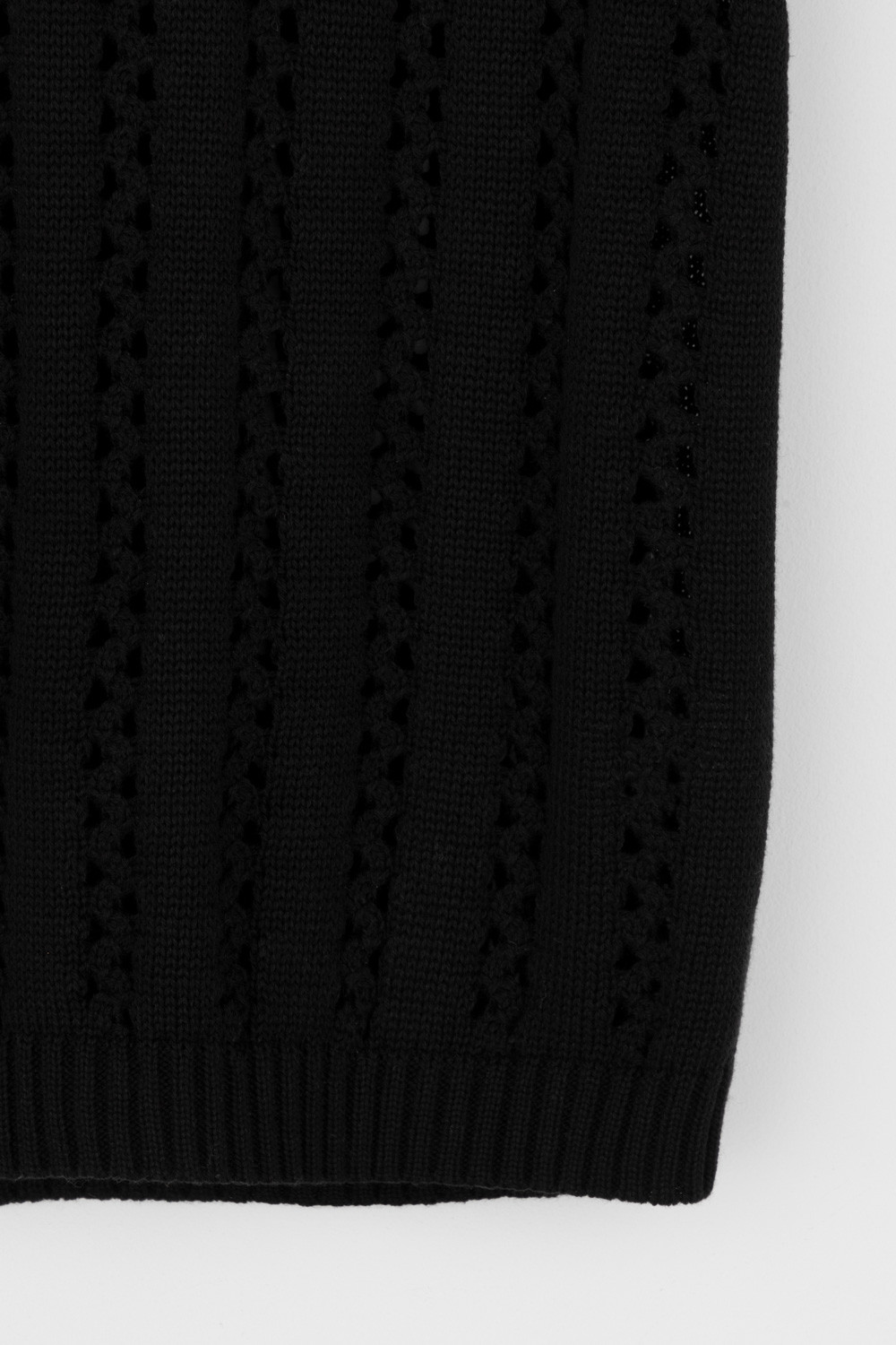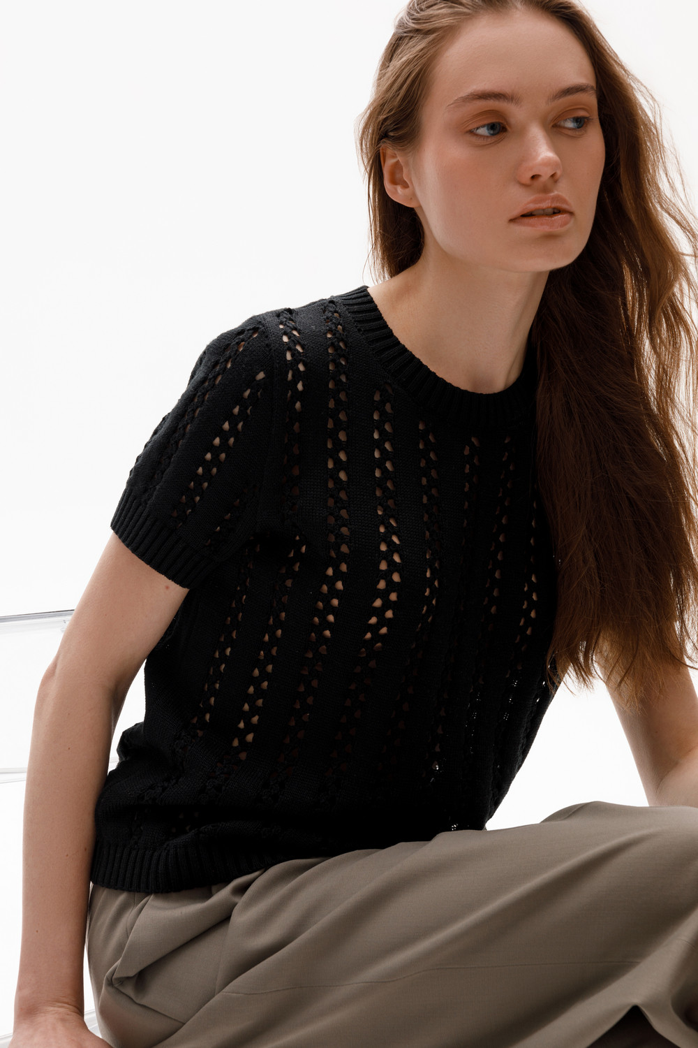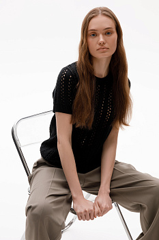 Джемпер из итальянской хлопковой пряжи выполнен ажурной, воздушной вязкой. Черный цвет и фактура делают его универсальным для различных образов.