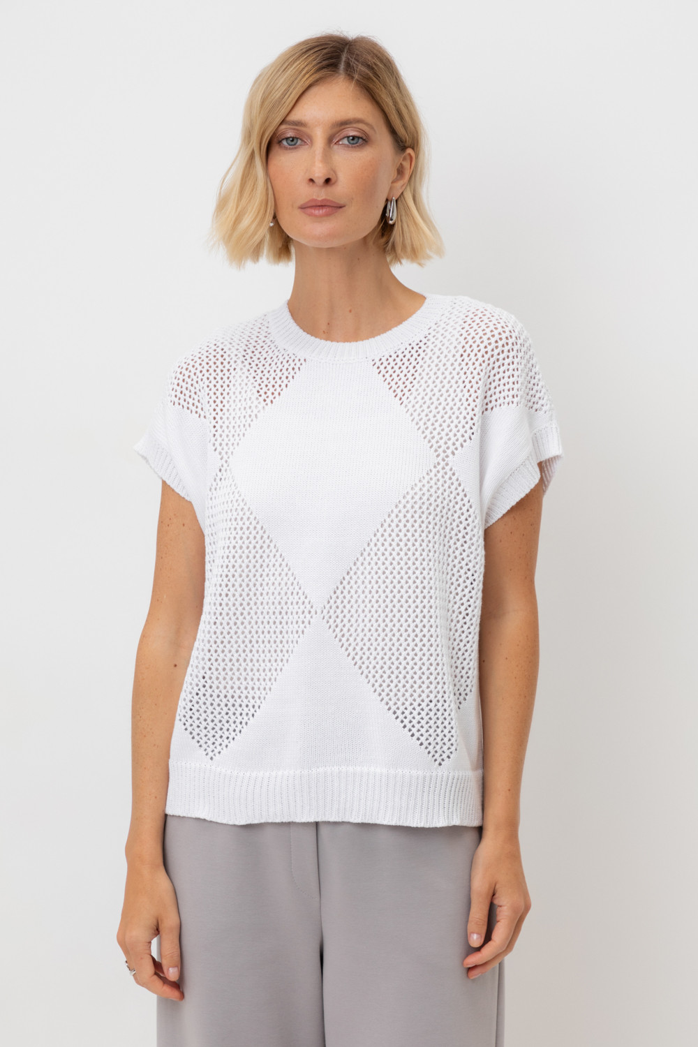 Джемпер со спущенным плечом ажурной вязки из итальянского хлопка. Умеренное переплетение, хлопок в составе придают изделию форму и ощущение комфорта во время носки. Незаменим в повседневном летнем гардеробе.