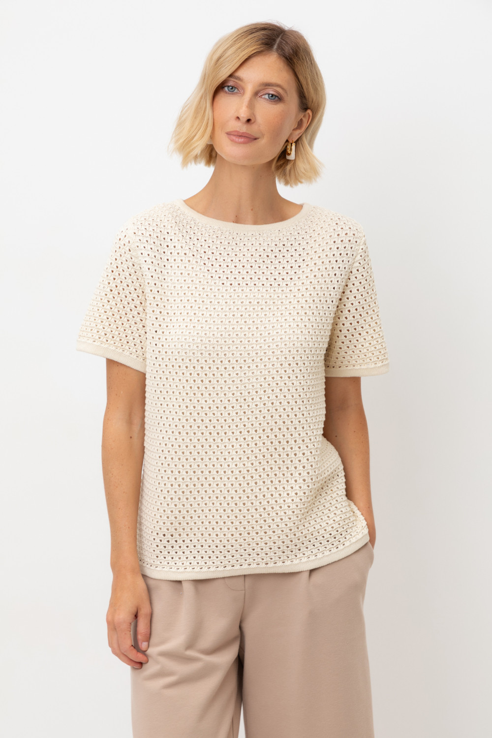 Джемпер с коротким рукавом ажурной вязки из итальянского хлопка. Умеренное переплетение, хлопок в составе придают изделию форму и дают ощущение комфорта во время носки. Незаменим в повседневном летнем гардеробе.