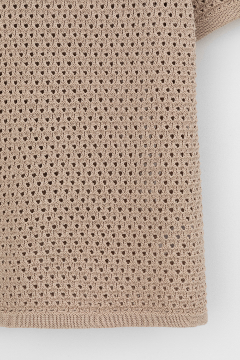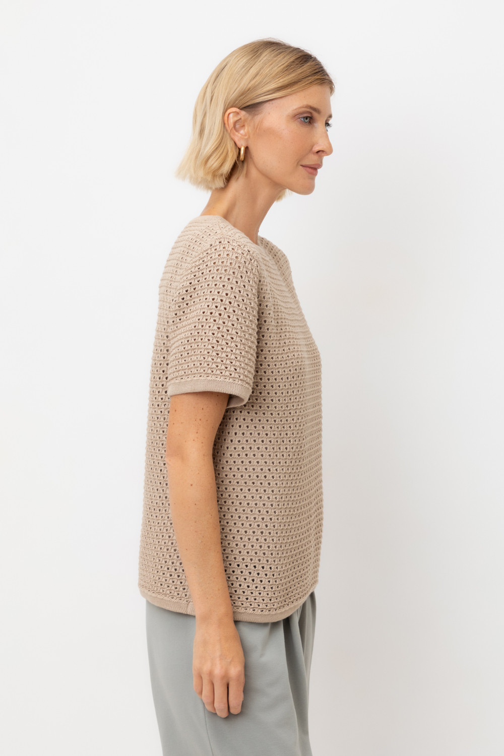 Джемпер с коротким рукавом ажурной вязки из итальянского хлопка. Умеренное переплетение, хлопок в составе придают изделию форму и дают ощущение комфорта во время носки. Незаменим в повседневном летнем гардеробе.
