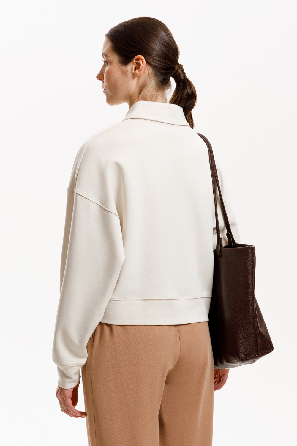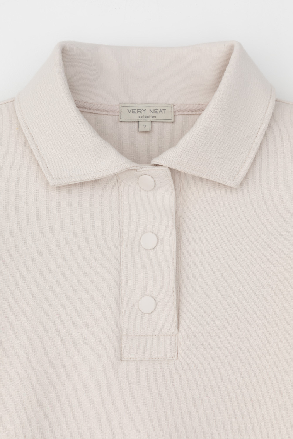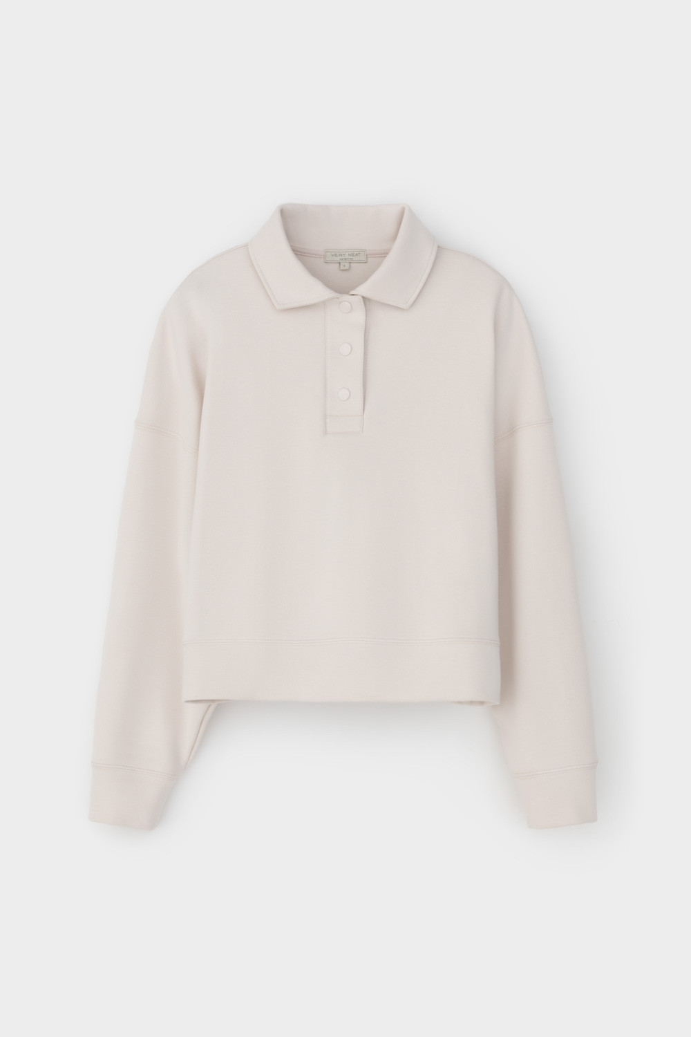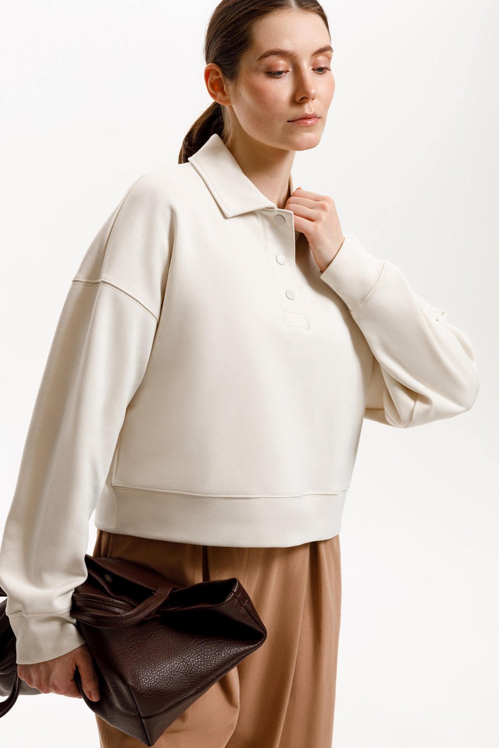 Джемпер-поло из высококачественного трикотажного полотна. За счет фактуры переплетения и специальных обработок сохраняют силуэт и форму. Хлопок в составе добавляет комфорт при носке. Выделяется благодаря спущенной линии плеча, что отличает его от традиционных моделей. Широкие манжеты и пояс формируют расслабленный стиль.