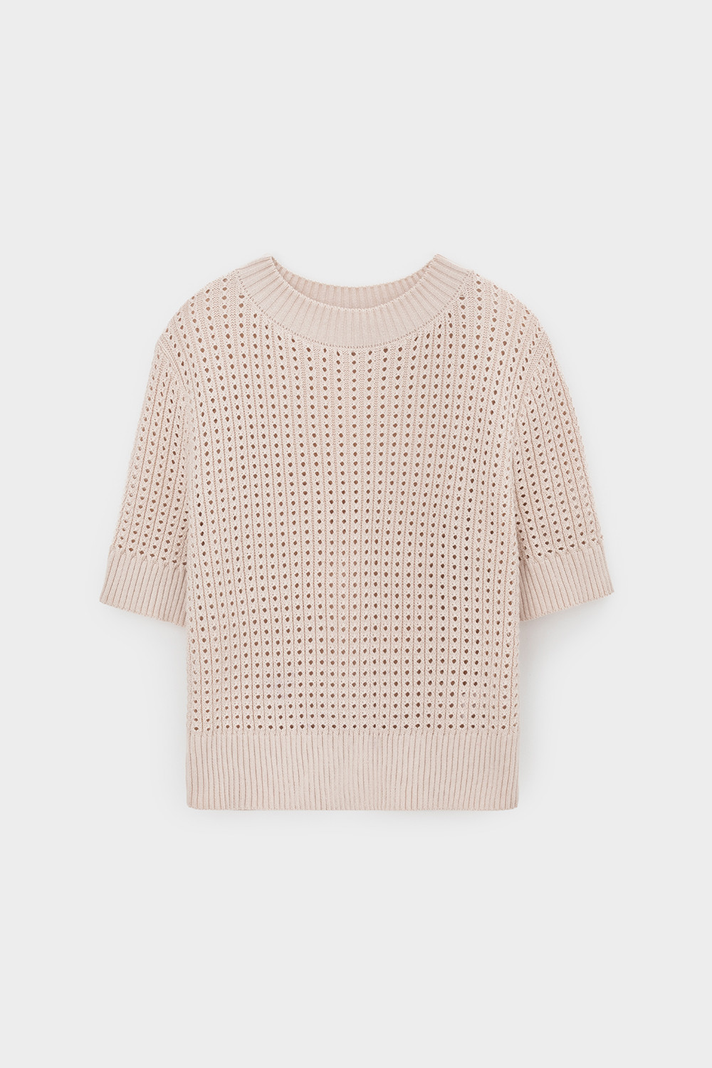 Джемпер с коротким рукавом ажурной вязки из итальянского хлопка. Умеренное переплетение, хлопок в составе придают изделию форму и дают ощущение комфорта во время носки. Незаменим в повседневном летнем гардеробе.
