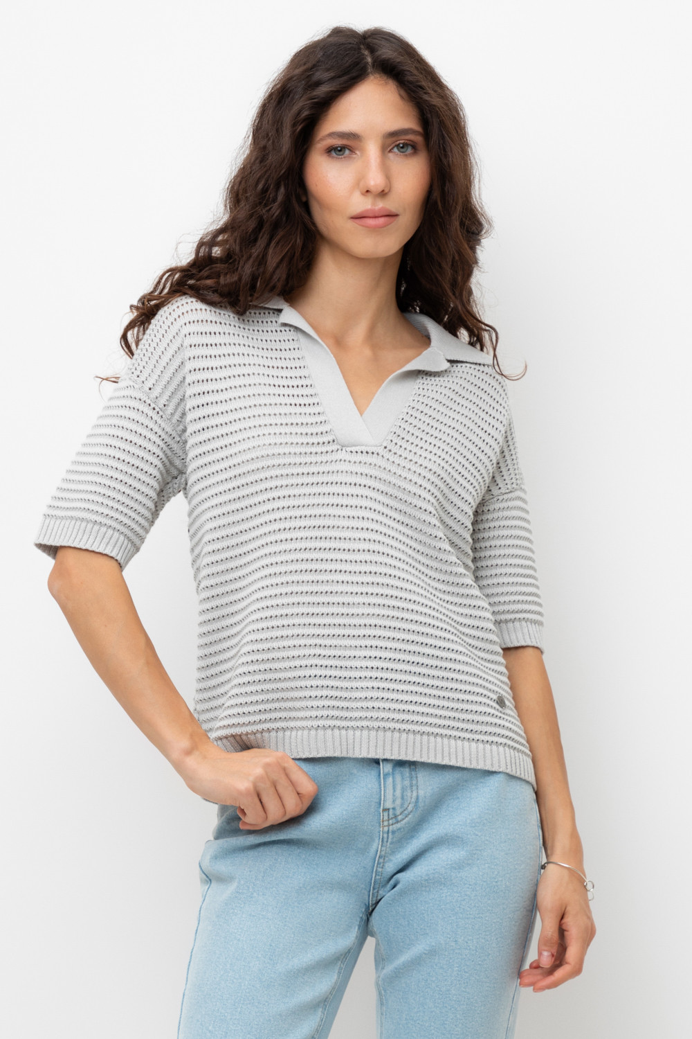 Воздушное поло ажурной вязки из итальянского хлопка. Мягкий воротник без застежки в стиле поло и спущенная линия плеча добавляет легкости при создании летних образов.