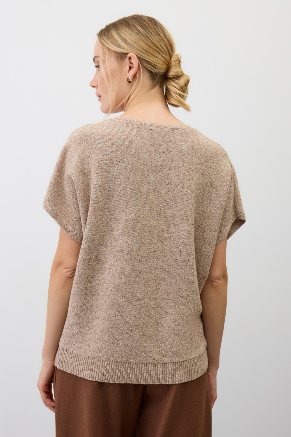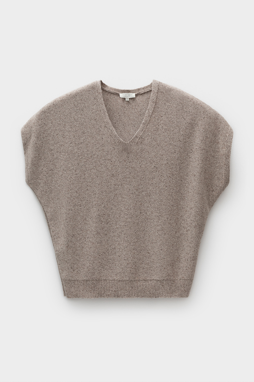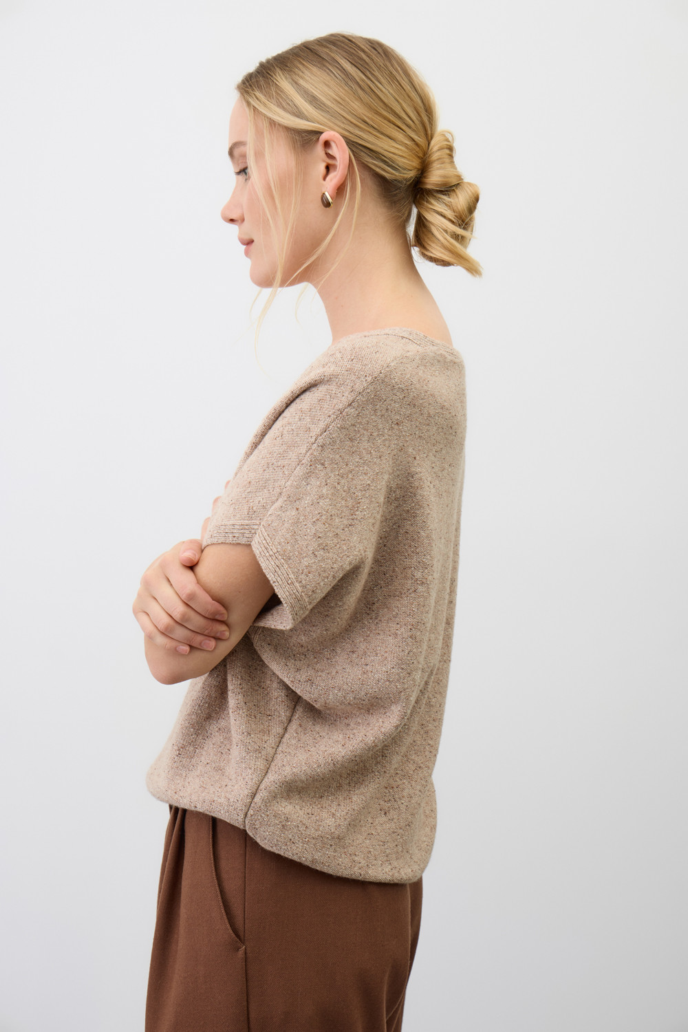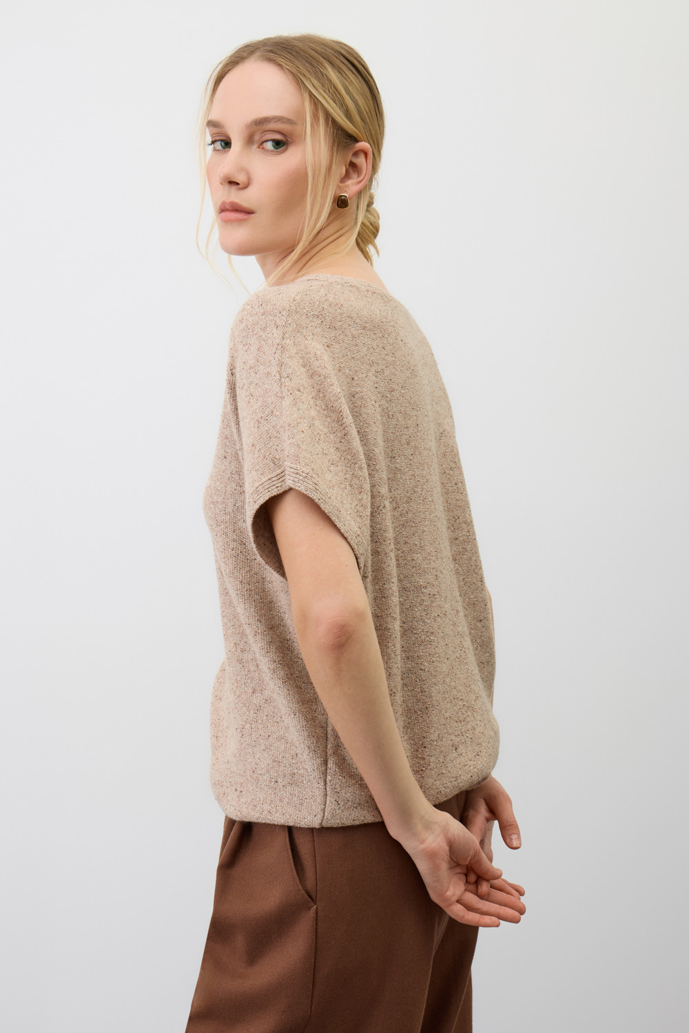 Джемпер с коротким  руковом из уникальной коллекции премиальных изделий, выполненных из итальянской шерсти, включает в себя мягчайшую шерсть мериноса и натуральный шелк. Это идеальное сочетание обеспечивает комфортное прилегание к телу, отличную терморегуляцию, воздухопроницаемость и отсутствие раздражения даже на самой чувствительной коже. Гладкая текстура с изысканными вкраплениями выглядит особенно стильно и современно.