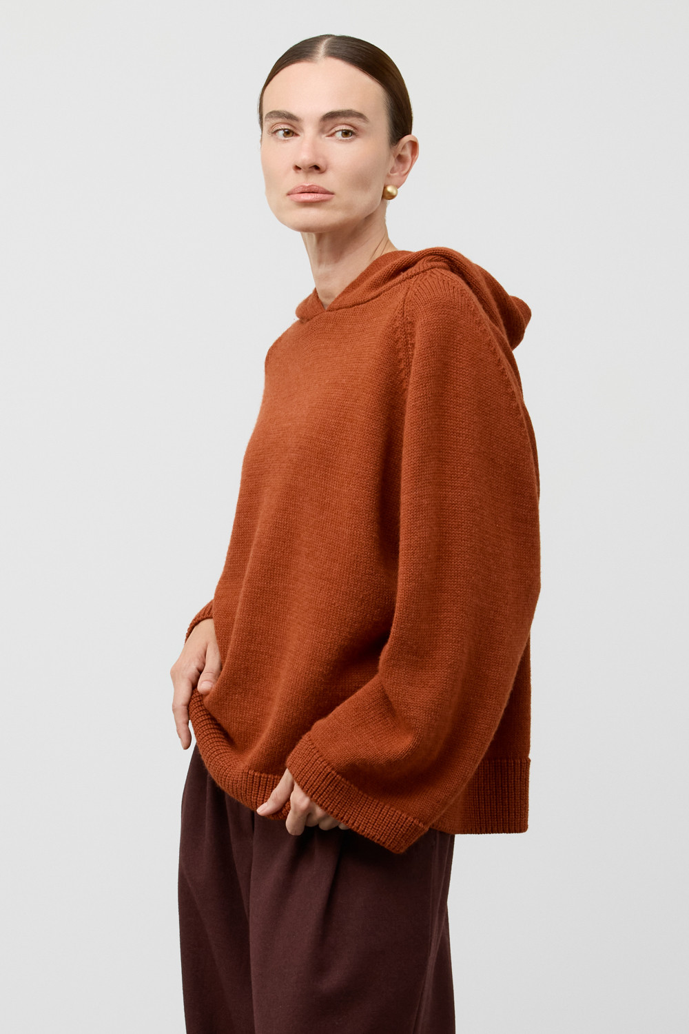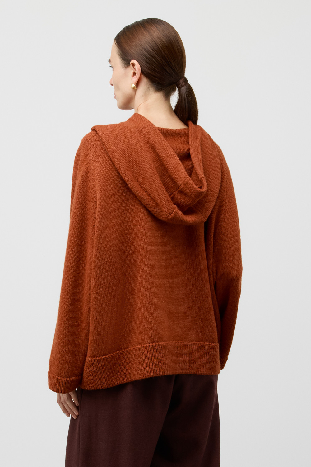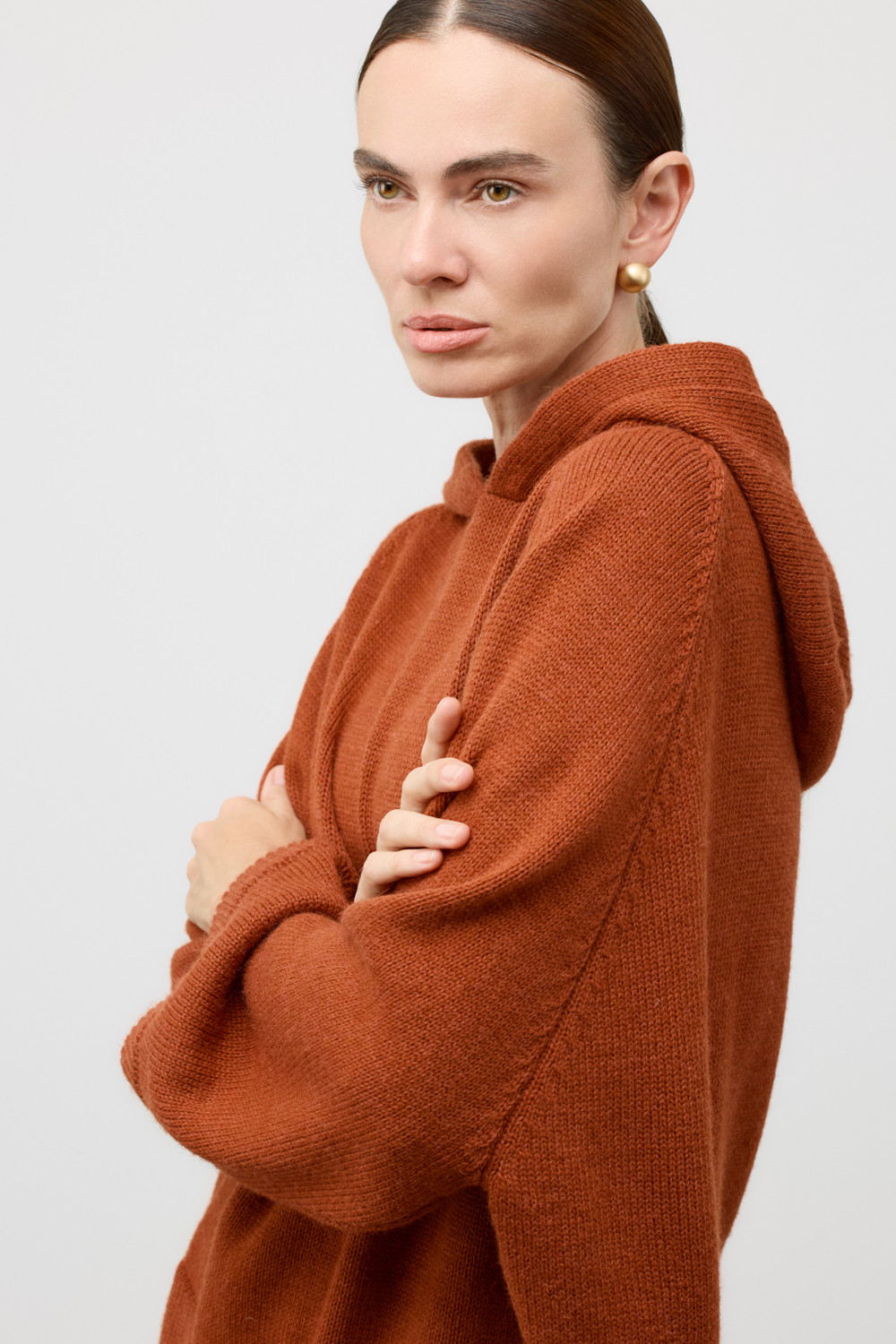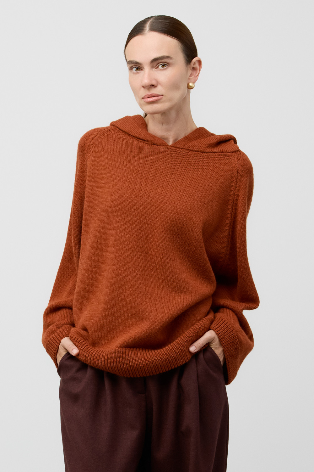 Мягкий джемпер с капюшоном, изготовленный из высококачественной пряжи. Уникальное сочетание шерсти и акрила дарит ощущение уюта, приятно прилегает к телу, является гипоаллергенным и отлично сохраняет форму. Капюшон добавляет стильную особенность изделию и становится практичным дополнением для ветренной погоды.