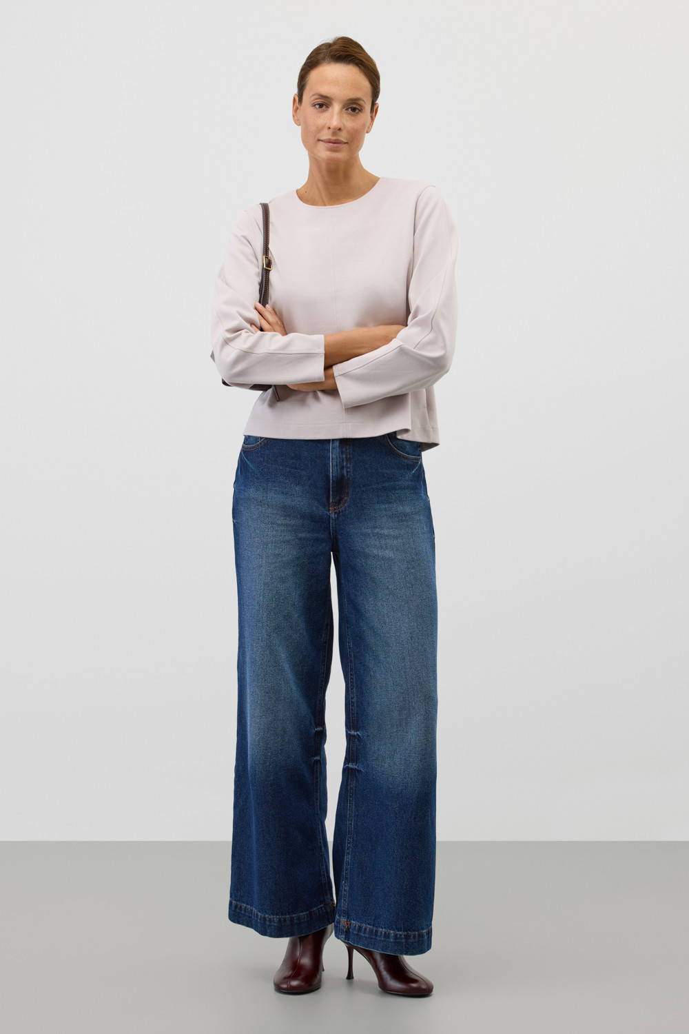 Модель имеет классический круглый вырез и прямой крой, что делает ее универсальной. Рельефный шов, расположенный по центру, добавляет изделию оригинальности.
