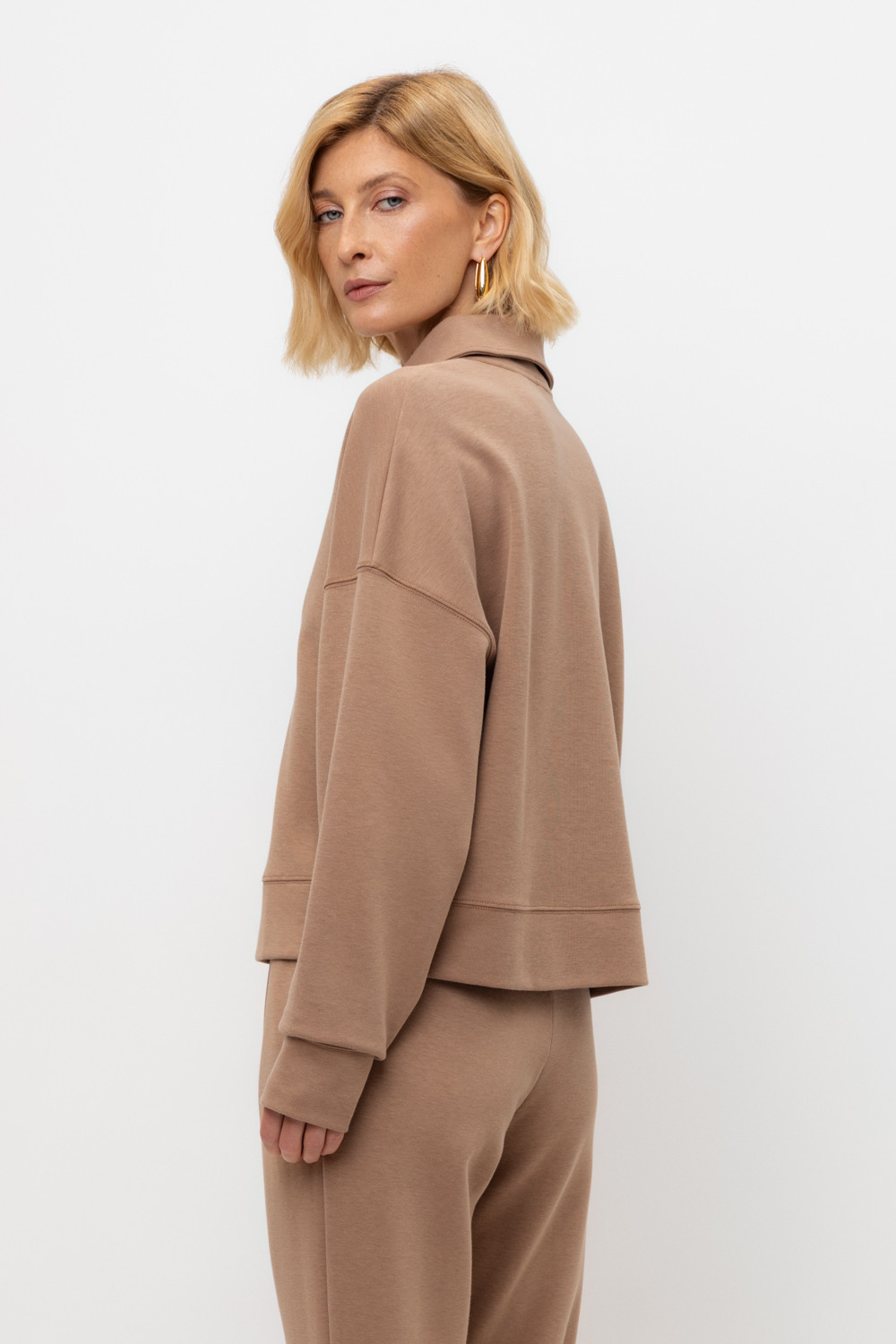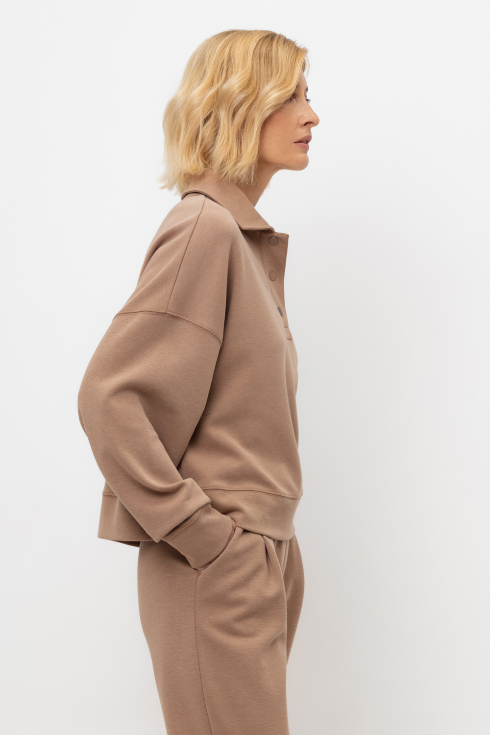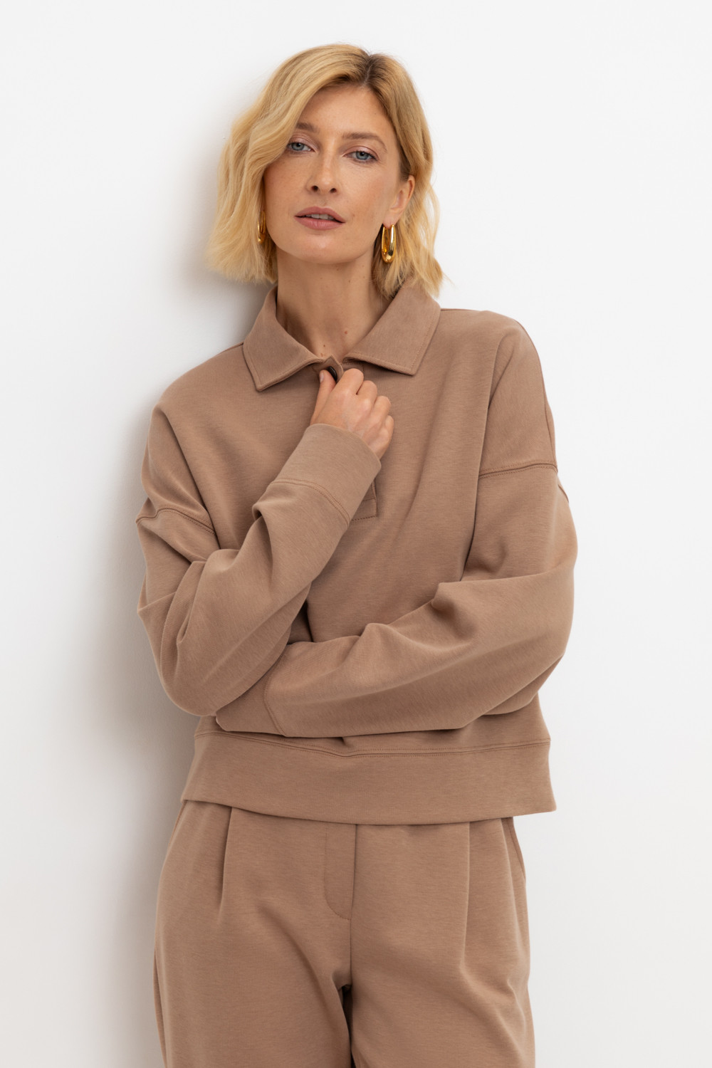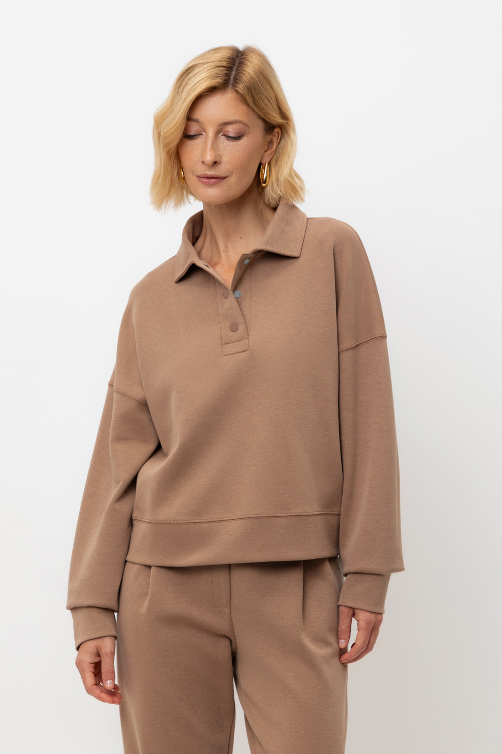 Джемпер-поло из высококачественного трикотажного полотна. За счет фактуры переплетения и специальных обработок сохраняют силуэт и форму. Хлопок в составе добавляет комфорт при носке. Выделяется благодаря спущенной линии плеча, что отличает его от традиционных моделей. Широкие манжеты и пояс формируют расслабленный стиль.