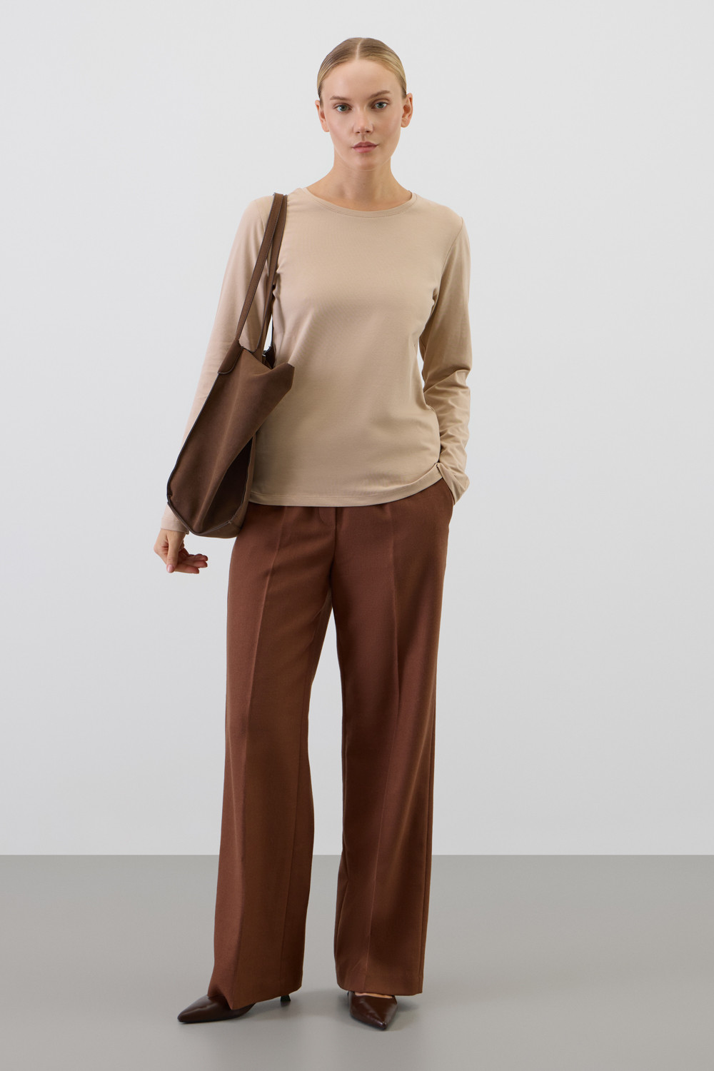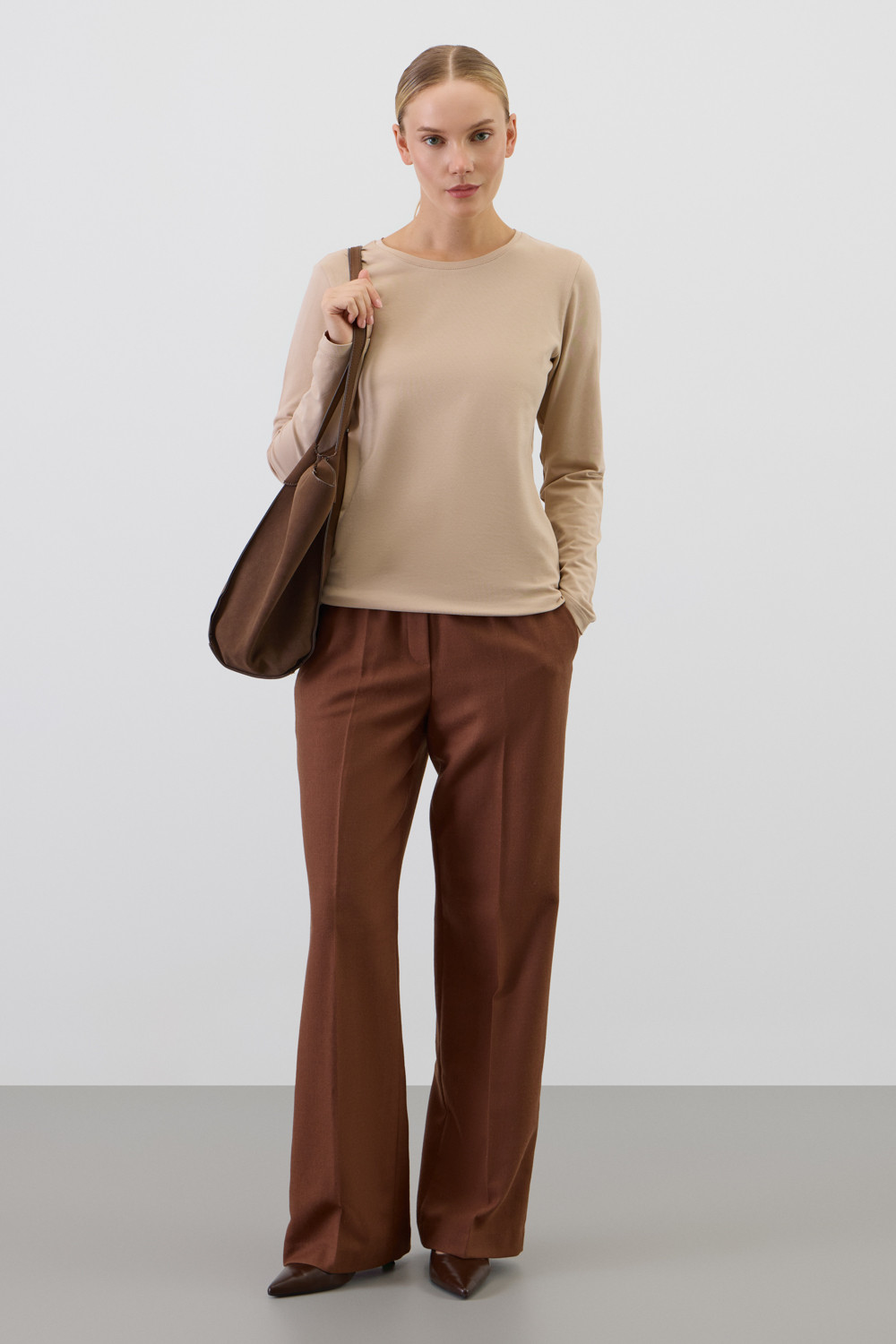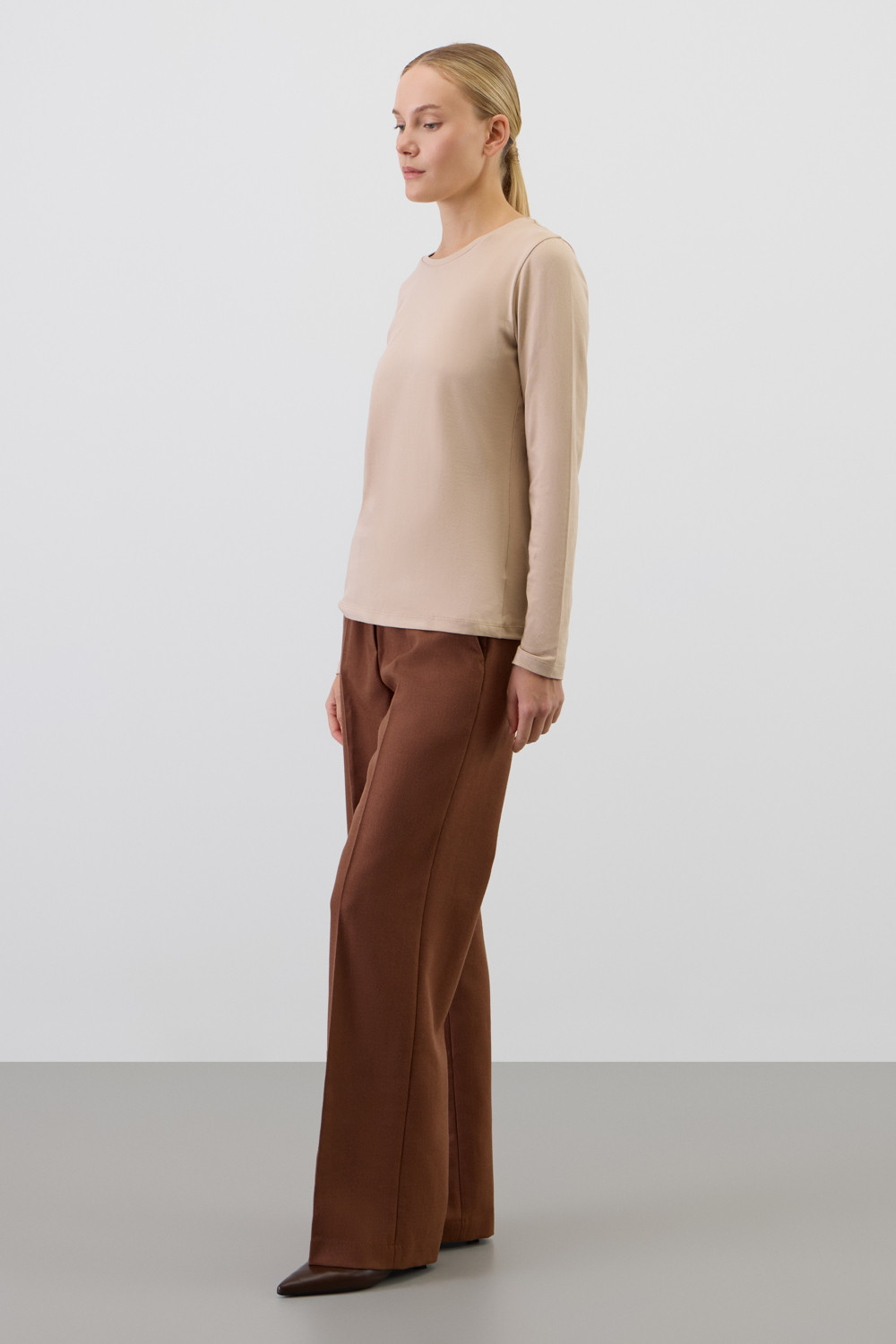Базовый лонгслив из премиального трикотажа DOUBLE FACE.  Особая обработка ткани придает легкость и шелковистость текстуры. Имеет классический круглый вырез и удобный прямой крой.