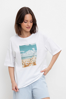 Удлиненная футболка из 100% натурального хлопка. Свободные рукава со спущенной линией плеча создают объём и свободный силуэт. Принт изготовлен из стойких текстильных красителей.