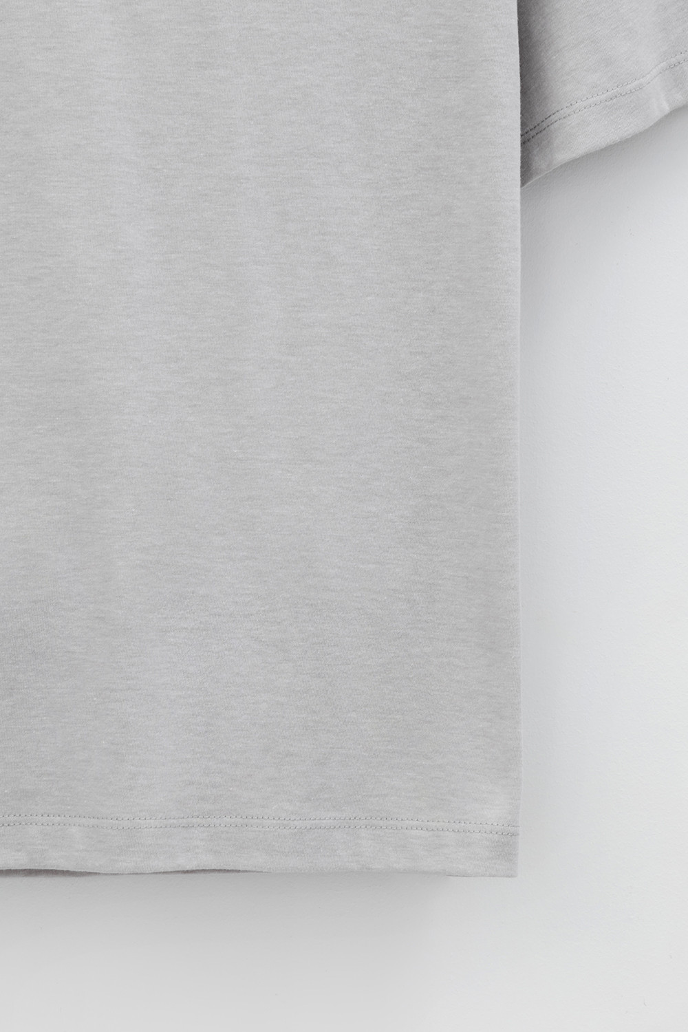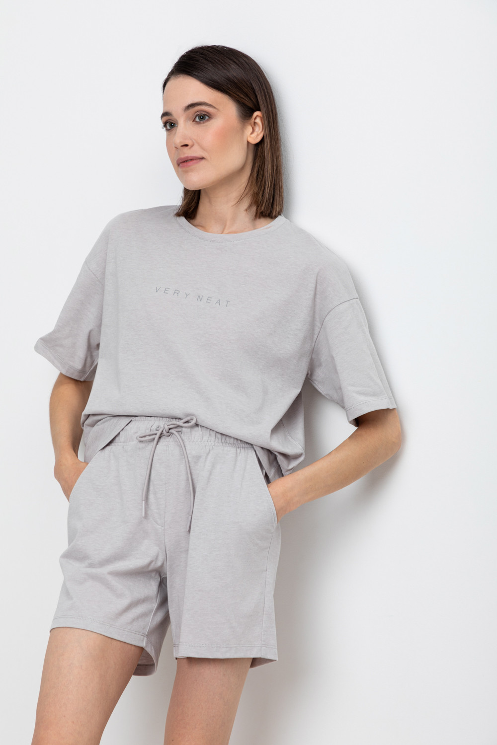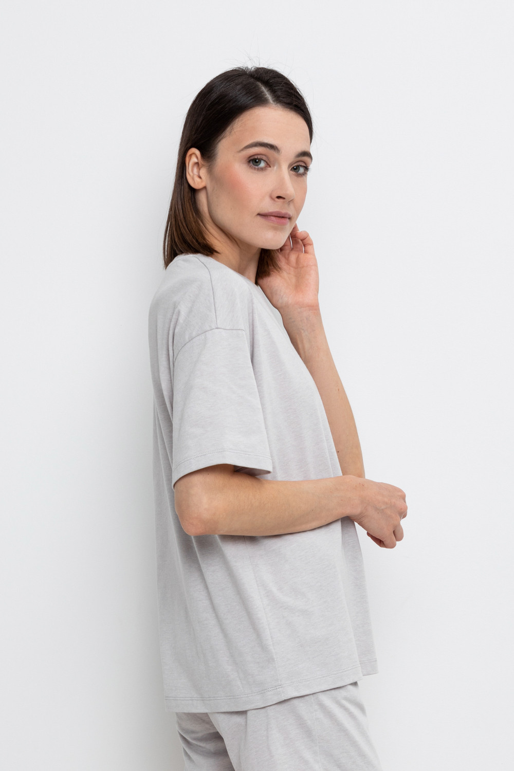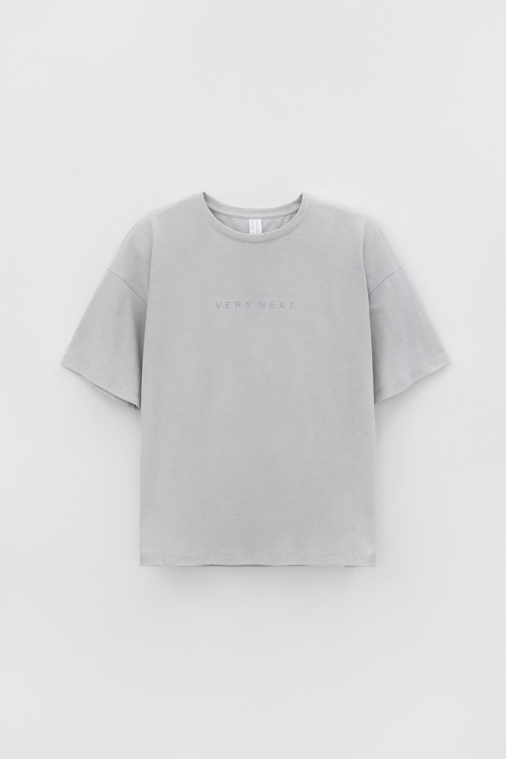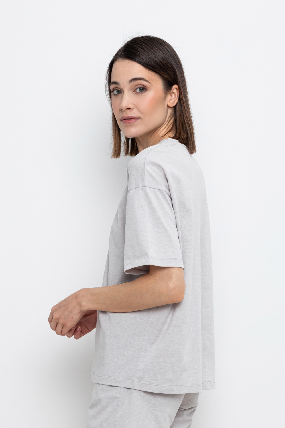 Удлиненная футболка из меланжевого трикотажа. Свободные рукава со спущенной линией плеча создают объём и свободный силуэт. Принт изготовлен из стойких текстильных красителей.