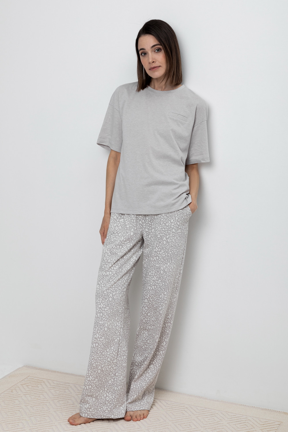 Легкий комплект для комфортного сна и отдыха. Футболка стандартной длины с короткими рукавами и спущенной линией плеча комфортно садится по фигуре. Брюки с удобными боковыми карманами выполнены из набивного трикотажа. Свободный силуэт не сковывает движения. Гладкий материал приятен к телу и позволяет коже дышать.
