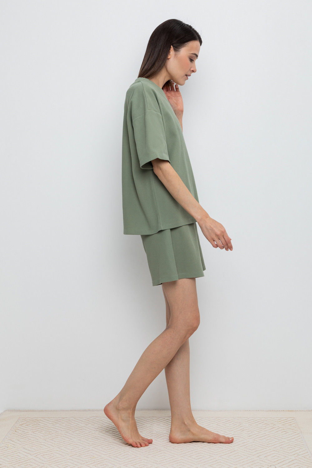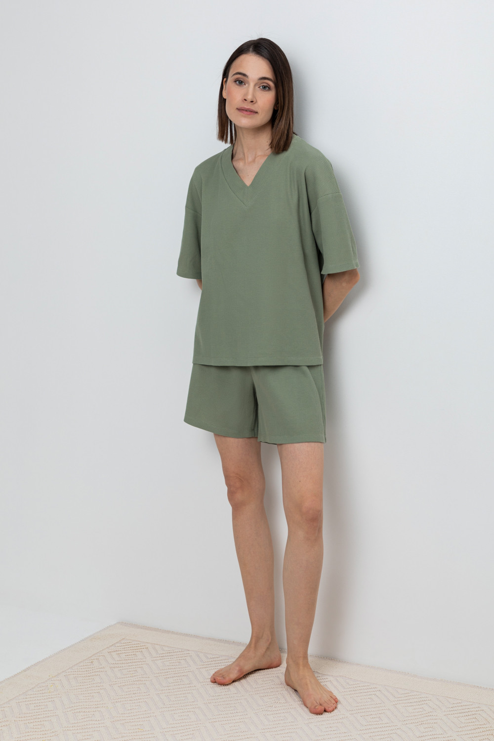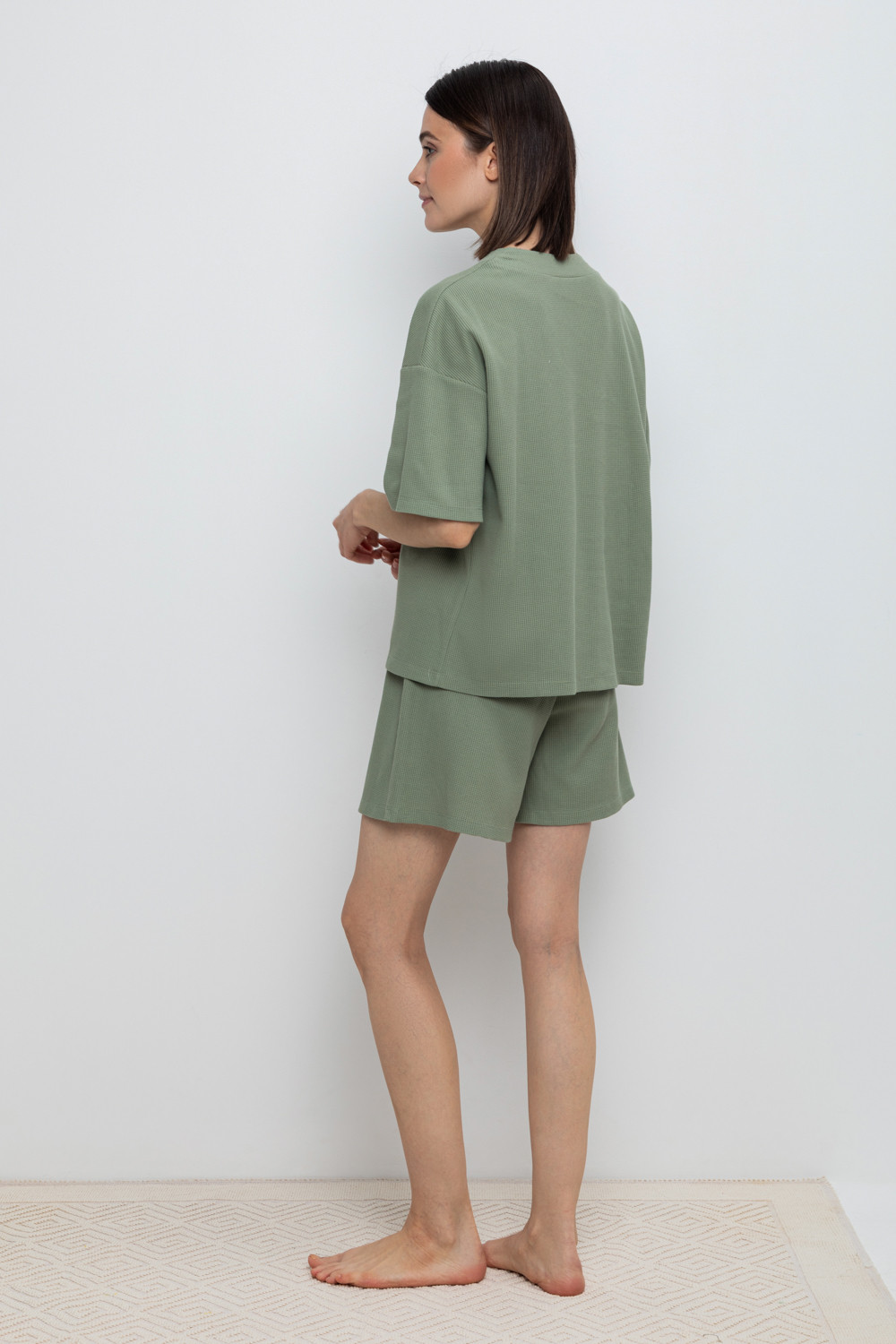 Комплект для комфортного отдыха из вафельного полотна. Укороченная футболка с короткими рукавами и спущенной линией плеча комфортно садится по фигуре. Шорты с мягким поясом на резинке и имитацией гульфика с пуговицами. Свободный силуэт не сковывает движения.