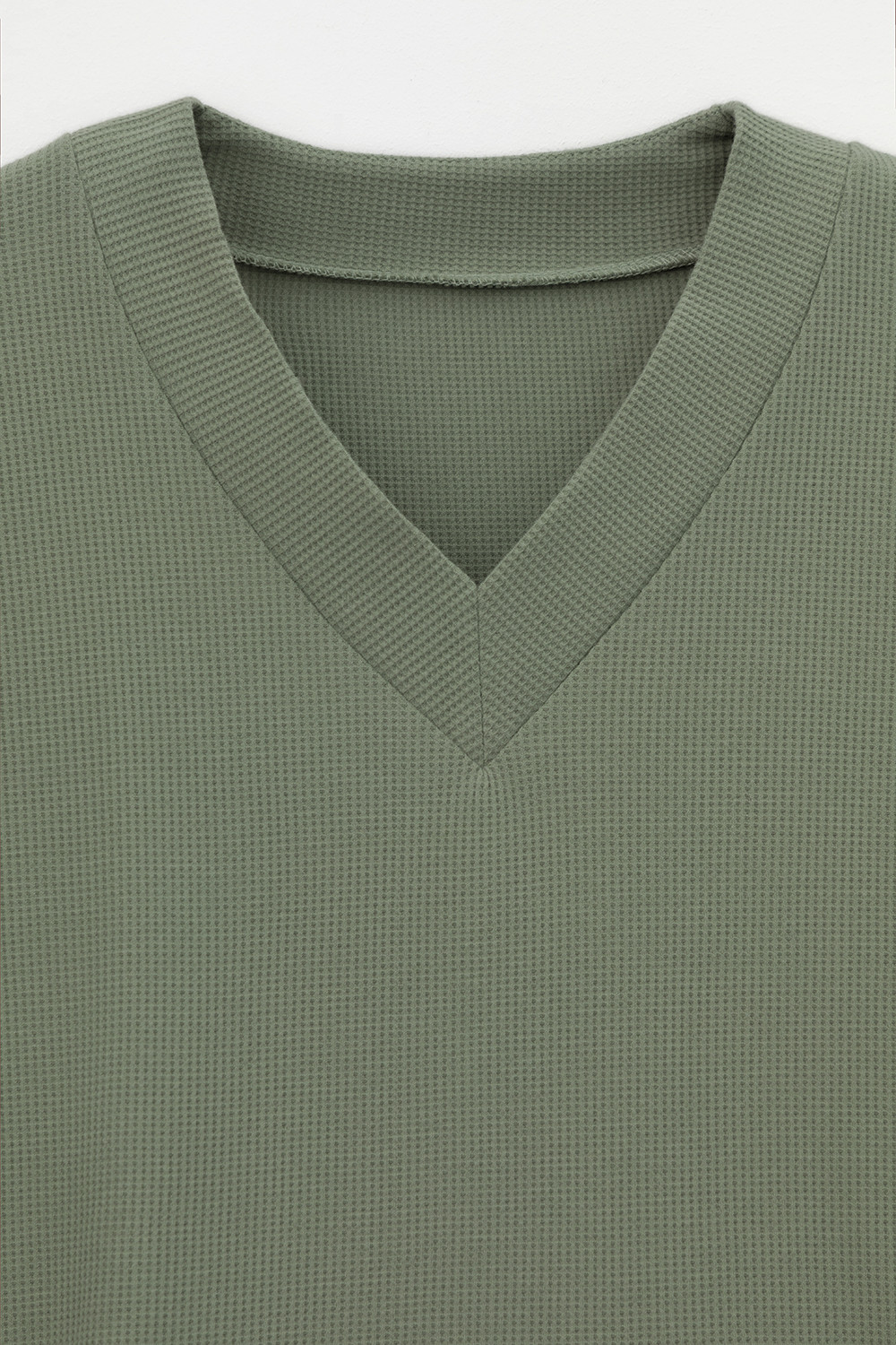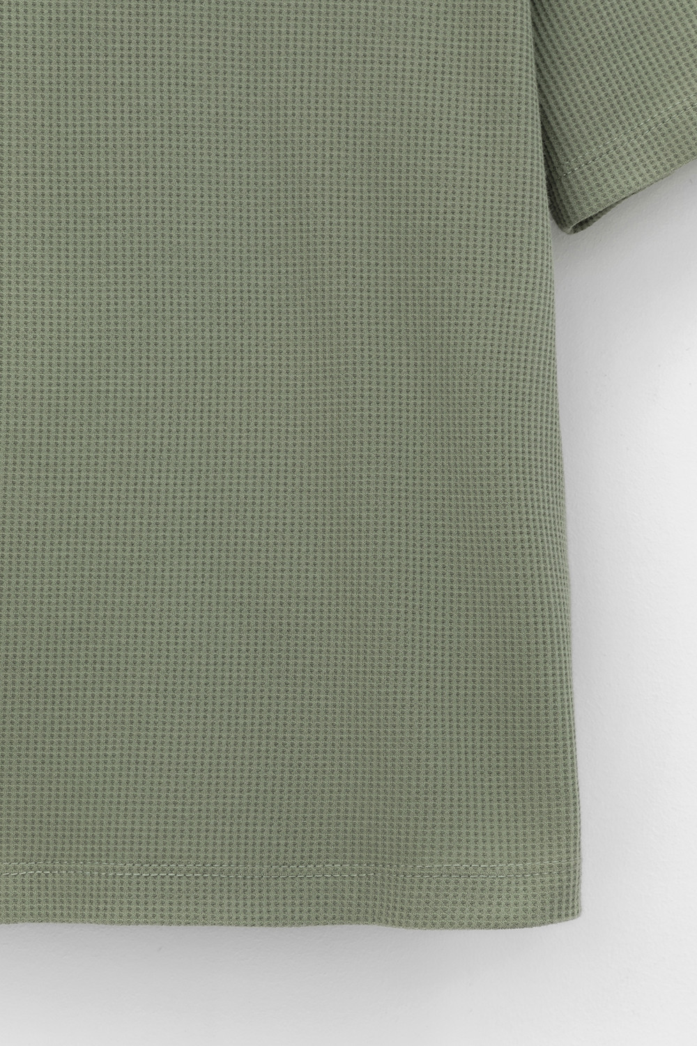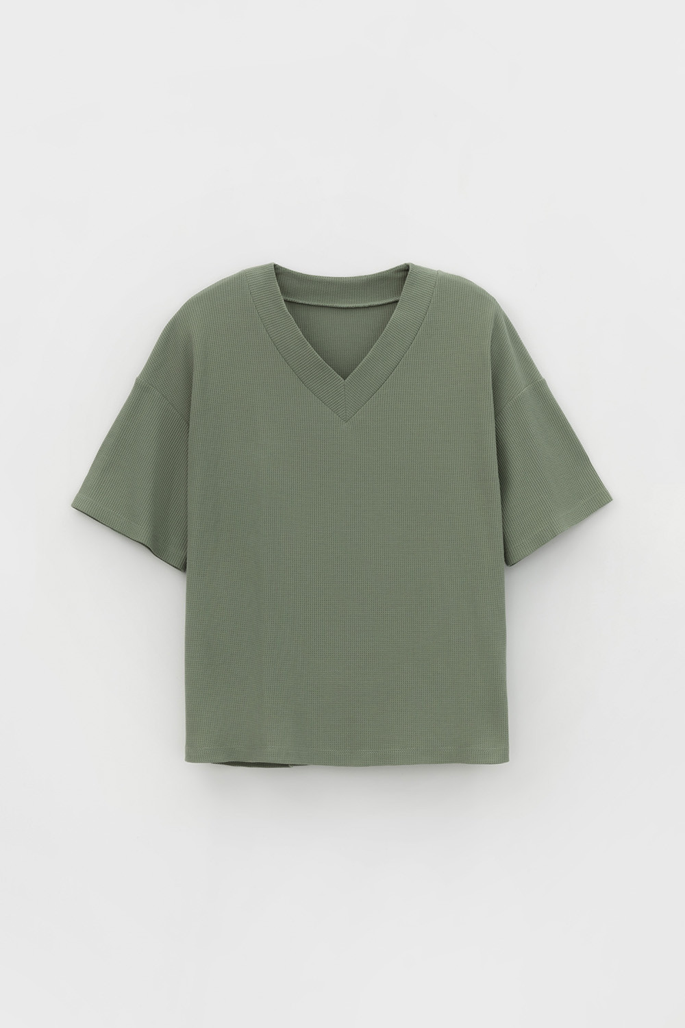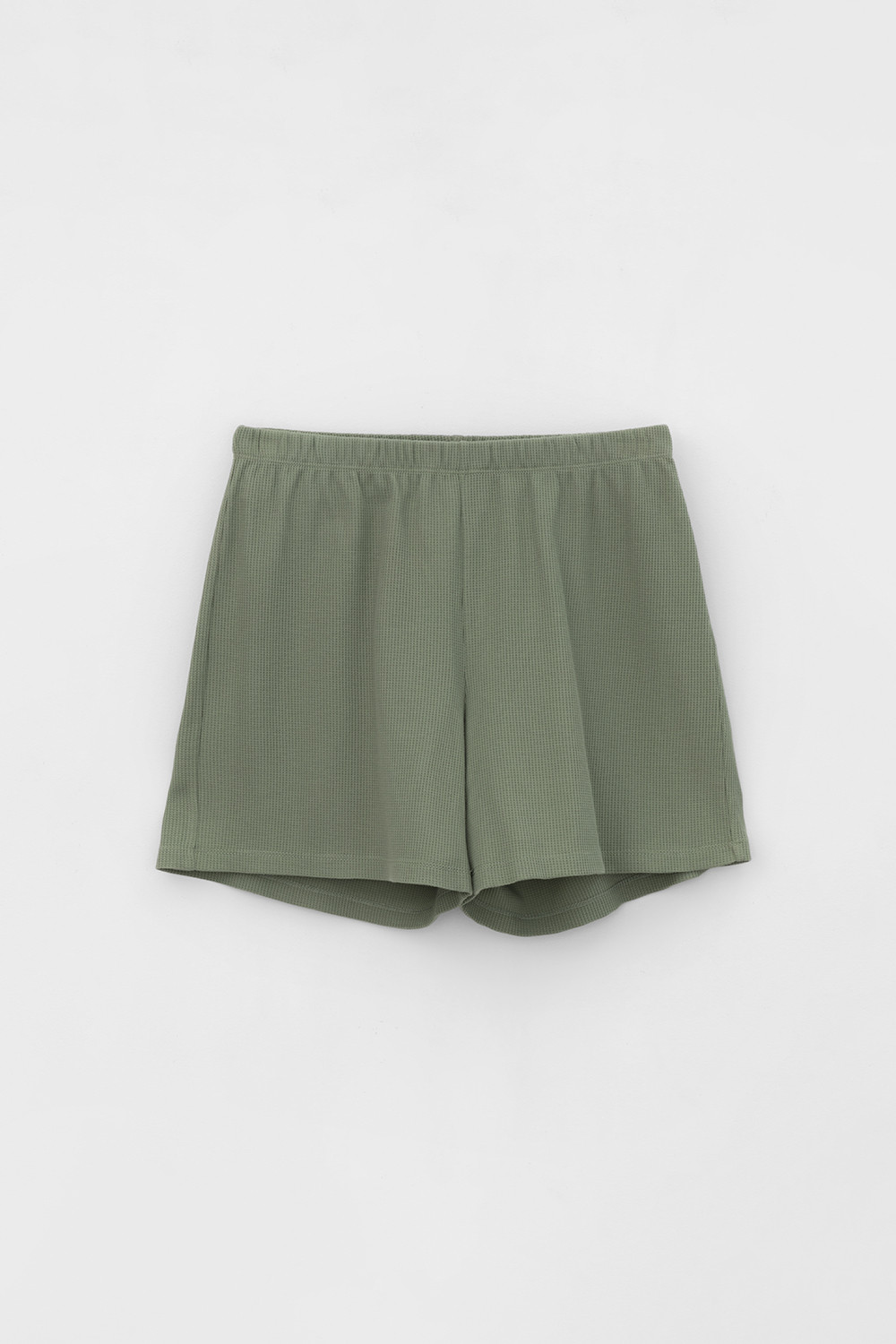Комплект для комфортного отдыха из вафельного полотна. Укороченная футболка с короткими рукавами и спущенной линией плеча комфортно садится по фигуре. Шорты с мягким поясом на резинке и имитацией гульфика с пуговицами. Свободный силуэт не сковывает движения.