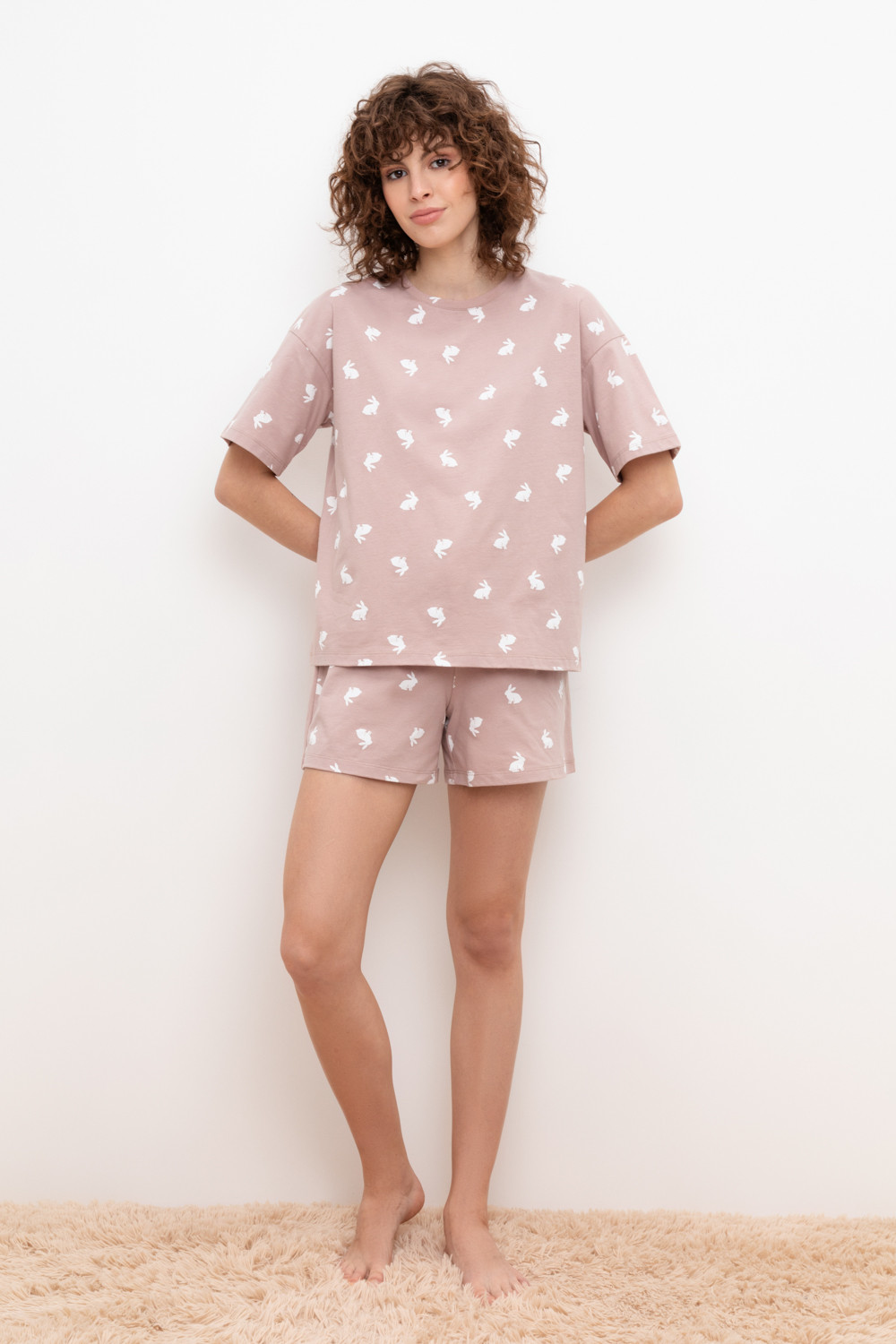 Комплект для комфортного отдыха из набивного трикотажа с нежным рисунком. Футболка с короткими рукавами и спущенной линией плеча комфортно садится по фигуре. Шорты с мягким поясом на резинке. Свободный силуэт не сковывает движения.