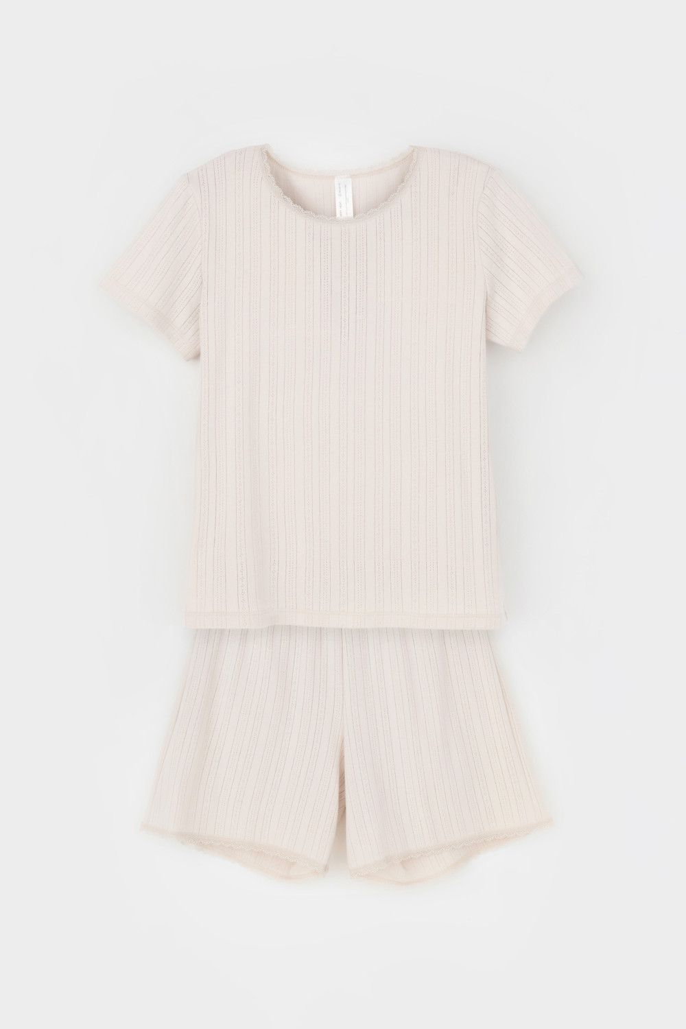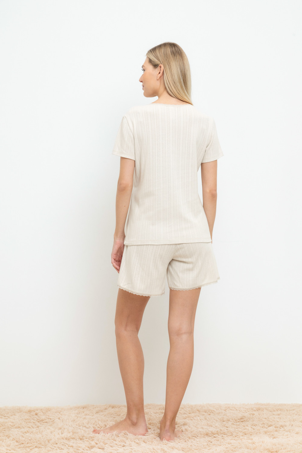 Комплект для комфортного сна из натурального хлопка. Футболка стандартной длины отделана эластичным кружевом. Шорты с мягким поясом на резинке удобно садятся по фигуре.